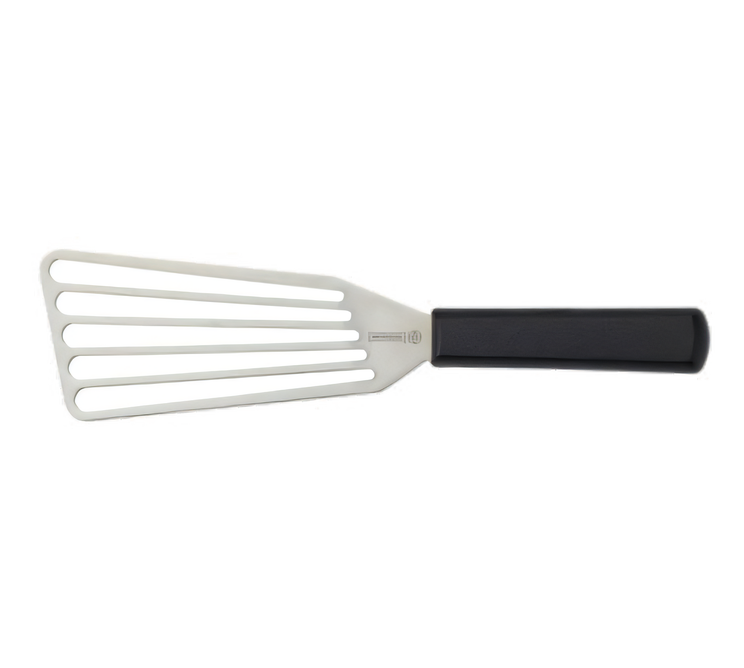 Mundial 5690 slotted fish spatula: NSF stainless blade, antimicrobial molded handle for safe, precise flipping and draining.