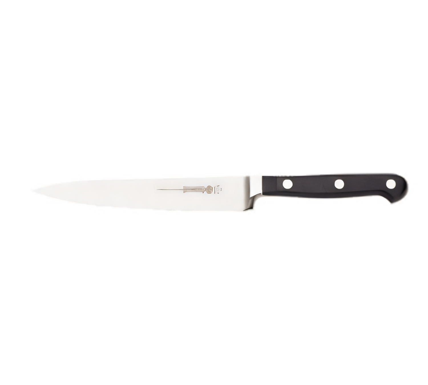 Mundial BP5111-6 6" forged high-carbon utility knife with NSF-rated no-stain blade and durable black polyacetal handle—gift boxed.