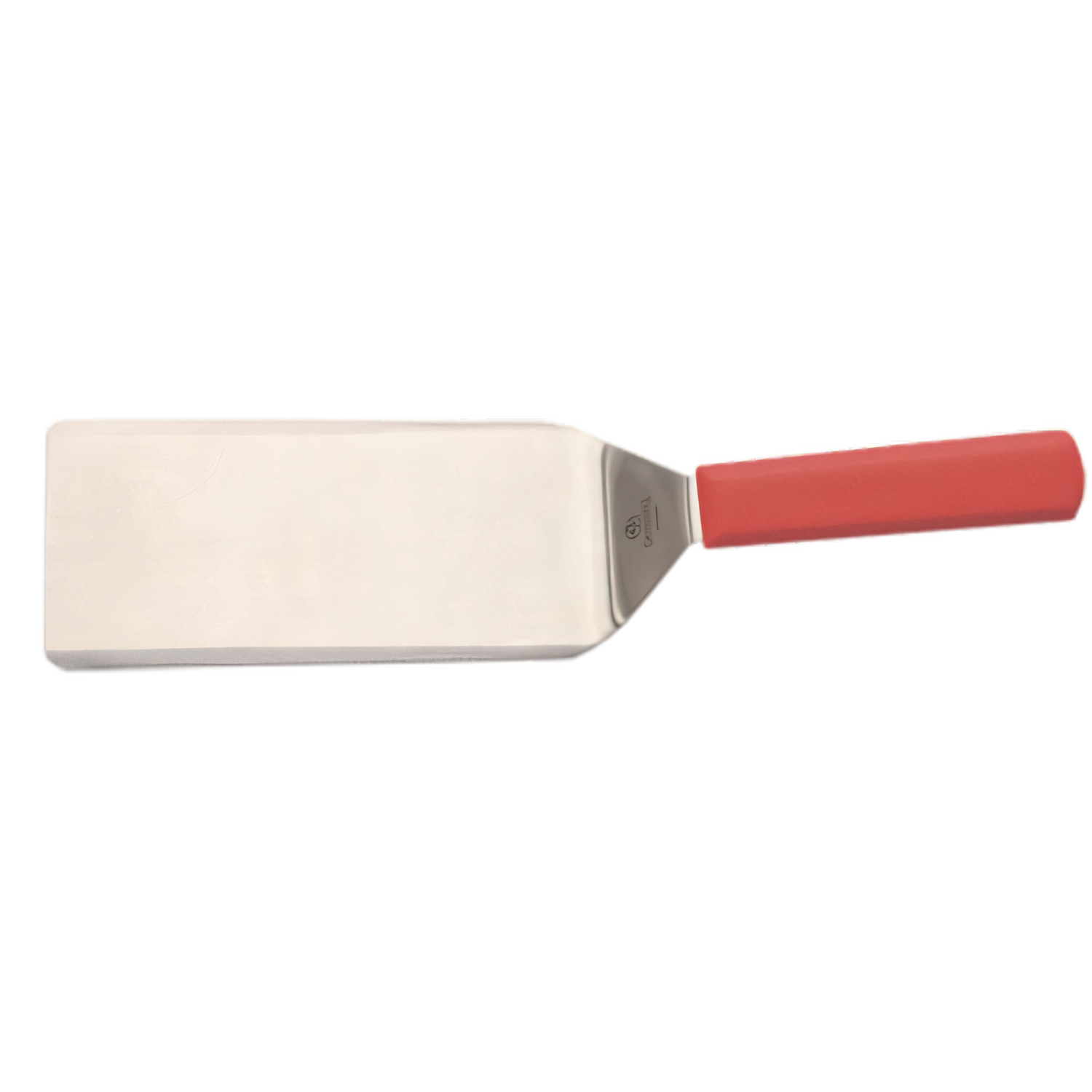 Turner, 4" x 8" x 15", beveled edges on two sides, stainless steel blade, red polypropylene handle, withstands temperature up to 446°F, treated with sanitized anti-microbial protection, NSF