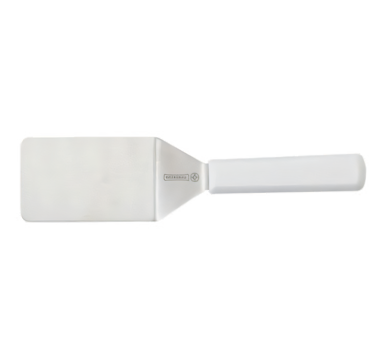 Mundial 4" stainless mini turner with antimicrobial, NSF-rated white polypropylene handle—durable, sanitary for residential kitchens.