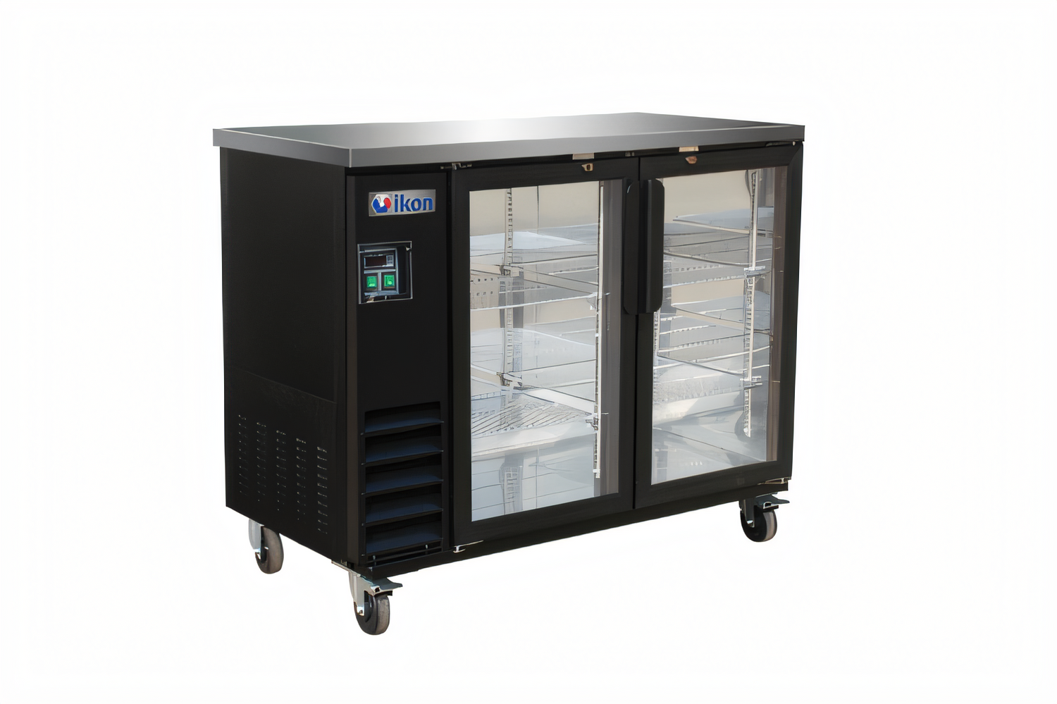 IKON Refrigeration Refrigerated Back Bar Storage Cabinet, two-section, 10.45 cu. ft. capacity, 49-1/10"W x 24-2/5"D x 41-3/4"H, stainless steel top, (2) sliding glass doors (lockable), (4) shelves, (288) 12 oz cans or (216) 12 oz bottles capacity, electronic thermostat, 33° to 40°F temperature range, digital LED temperature display, stainless steel interior, black exterior, left-side mounted self-contained refrigeration, R290 refrigerant, 4" casters (2) braked, 115v/60/1-ph, cord with NEMA 5-15P, 0.40 hp, 3 amps, cETLus, ETL-Sanitation