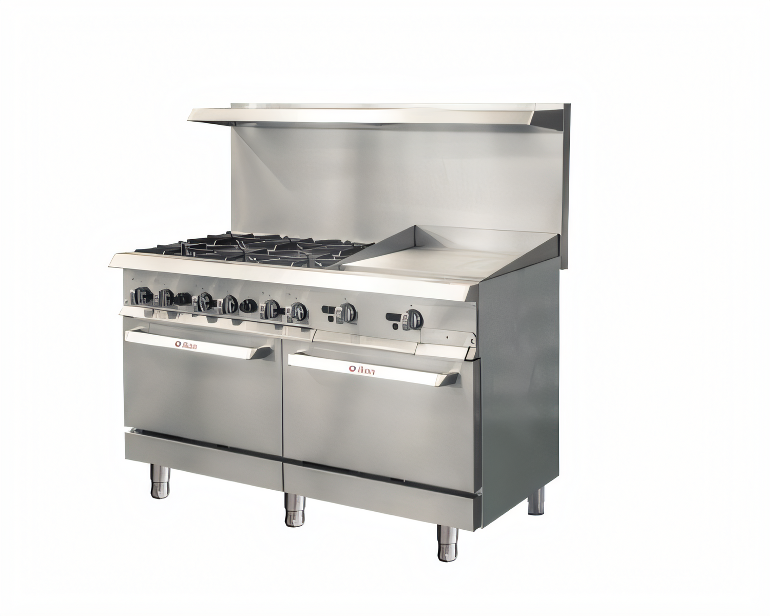 Model IR-6B-24TG-60 · CSA Sanitation, Flame & Star certifiedBuilt for high-volume kitchens that refuse to compromise on versatility or durability, this Ikon 60 inch range packs 306,000 BTU* of total cooking power into a heavy-duty stainless-steel frame. Six open burners sit beside a full 24 inch, 1 inch-thick thermostatic griddle, while twin static ovens handle everything from roasted entrées to baked desserts.