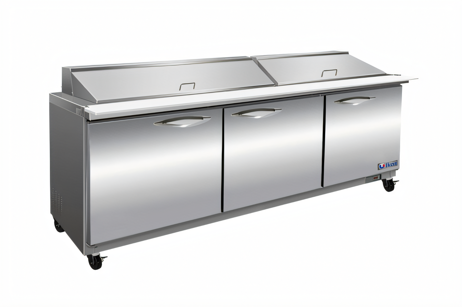 IKON Refrigeration Mega Top Sandwich / Salad Prep Unit, three-section, 18 cu. ft. capacity, 71-7/10"W x 34-1/2"D x 43-1/5"H, stainless steel top with opening for (27) 1/6 pans (included), (3) solid hinged doors, (3) adjustable shelves, removable cutting board, electronic thermostat, 33° - 40°F temperature range, digital LED temperature display, automatic defrost, interior: 304 stainless steel floor, aluminum back wall, ABS side walls & door backs, stainless steel front & sides, 2-1/2" swivel casters (2) braked, rear mounted self-contained refrigeration system, R290 refrigerant, 1/2 HP, 115v/60/1-ph, 4.3 amps, NEMA 5-15P, cULus, UL EPH