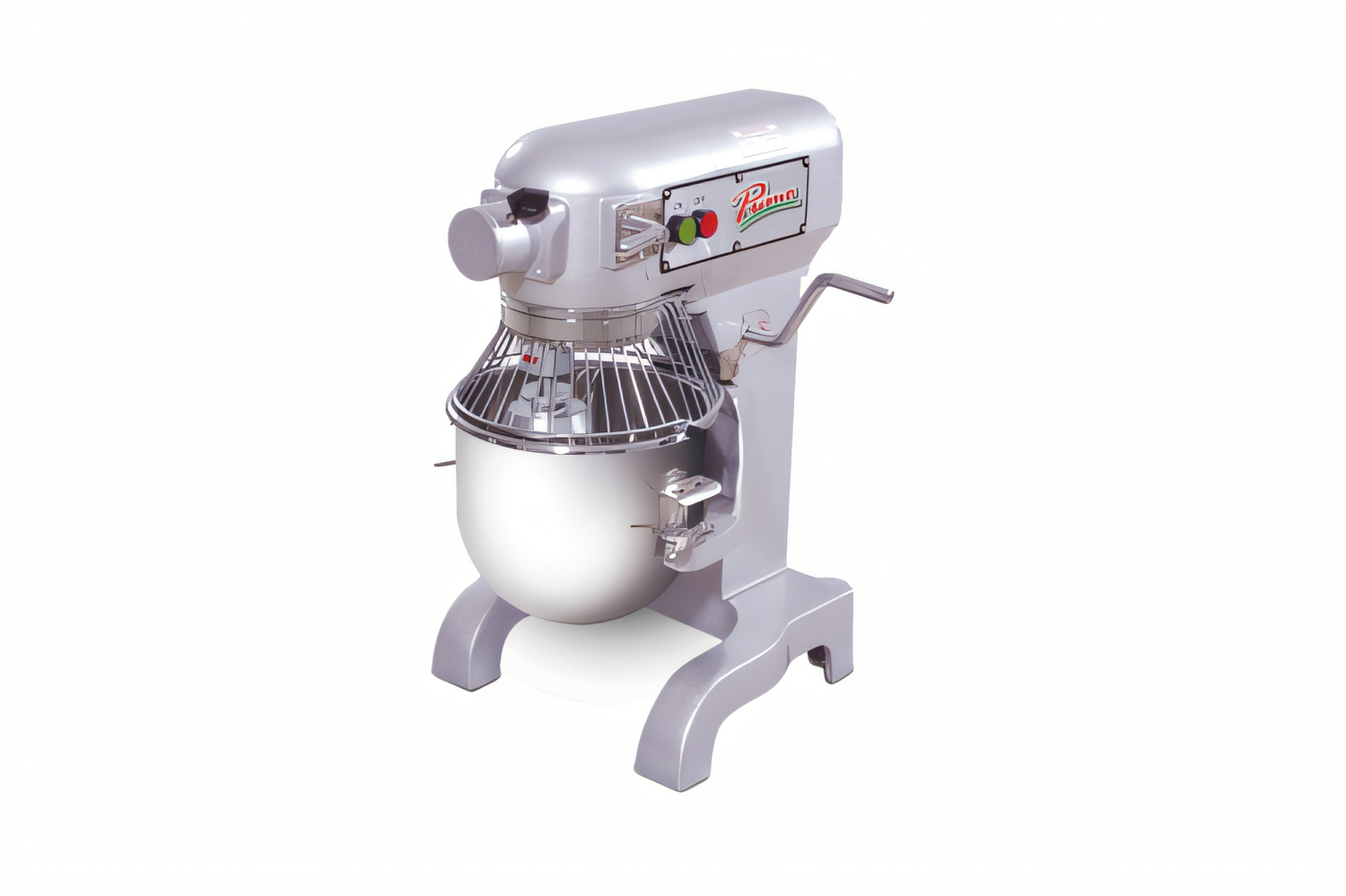 Primo Commercial Planetary Mixer, 10 quart bench model, capacity, (3) speed gear driven, #12 power drive hub, side mounted start, silent operation, includes: stainless steel bowl, bowl guard & wire whip, aluminum flat beater & dough hook, 0.60 HP, cETLus, ETL-Sanitation