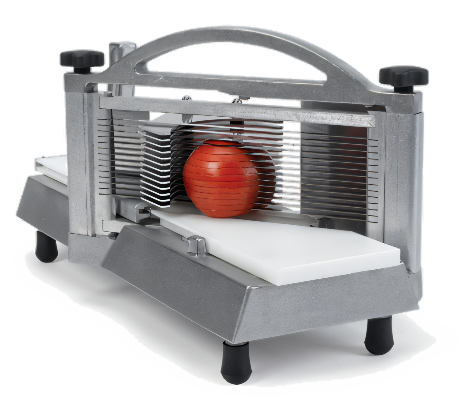 Easy Tomato Slicer II, 3/16" compact slice, razor-sharp blades, pretensioned cartridge blade assembly, specially placed guards, polyethylene slide board, ergonomic handle & self-lubrication track, rubber feet & table stop, NSF