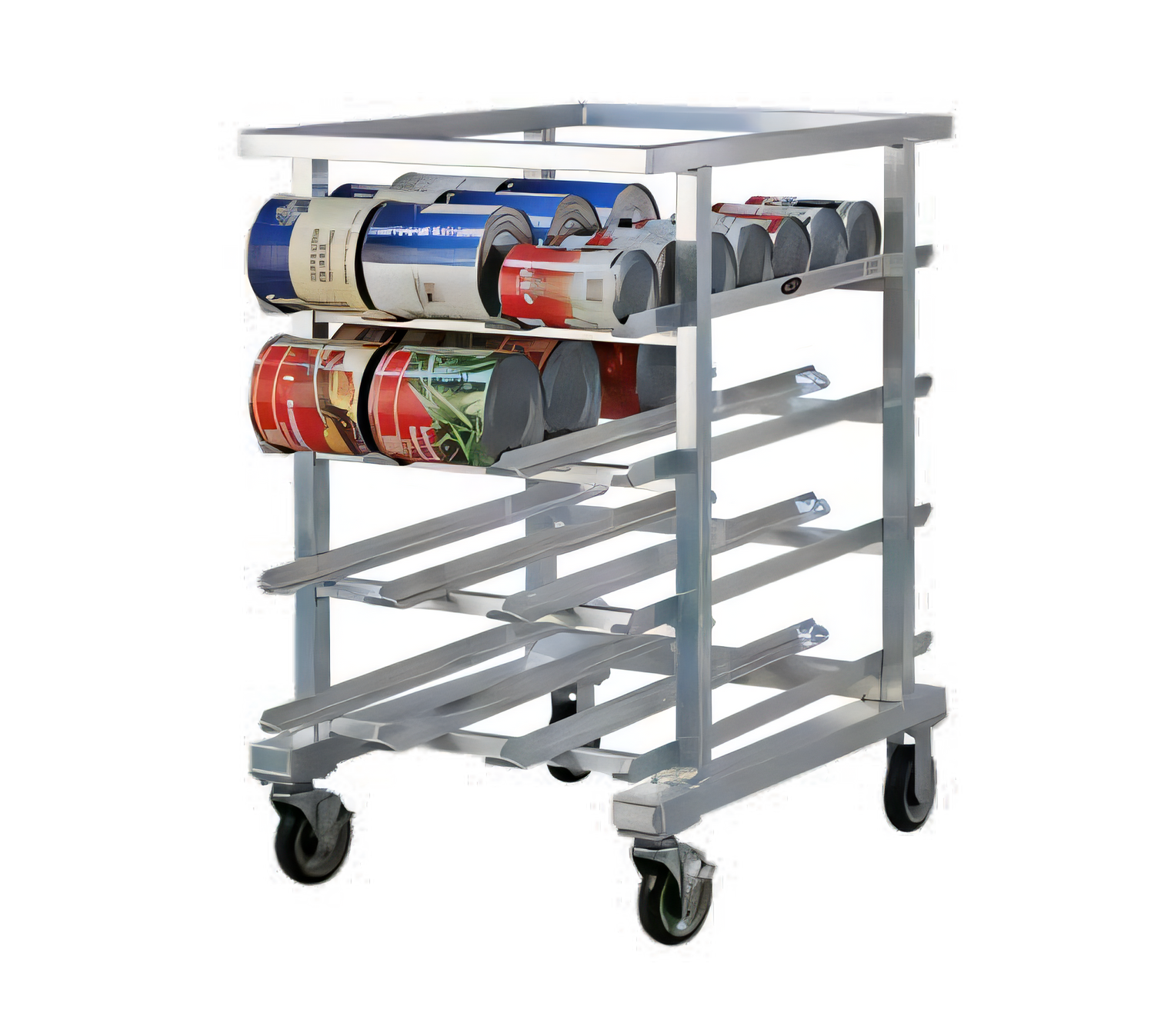 Can Storage Rack, mobile, half-size, aluminum construction with no top, sloped glides, accommodates (72) #10 cans or (96) #5 cans, (2) swivel/brake & (2) rigid 5" platform casters, NSF, Made in USA, (standard factory lead time)