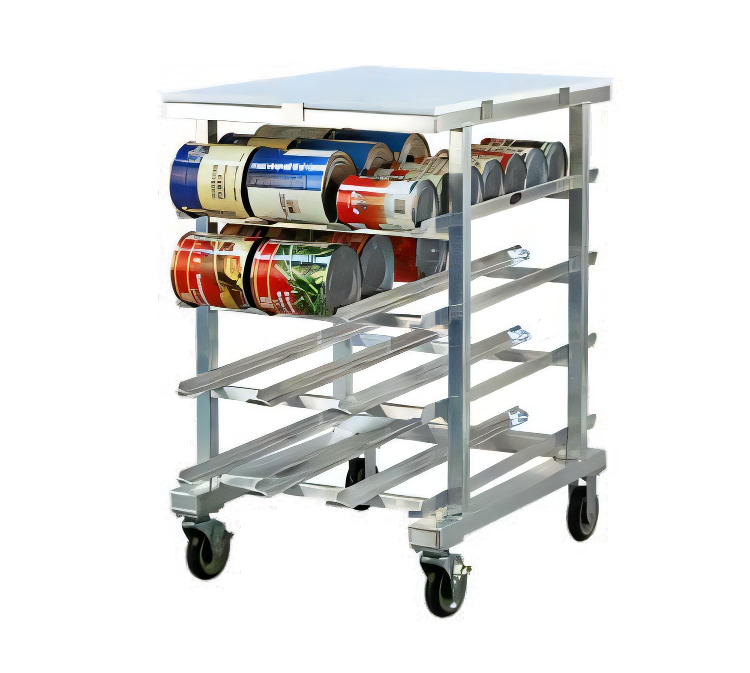 Can Storage Rack, mobile, half-size, aluminum construction with Poly top, sloped glides, accommodates (72) #10 cans or (96) #5 cans, (2) swivel/brake & (2) rigid 5" platform casters, NSF, Made in USA, (standard factory lead time)