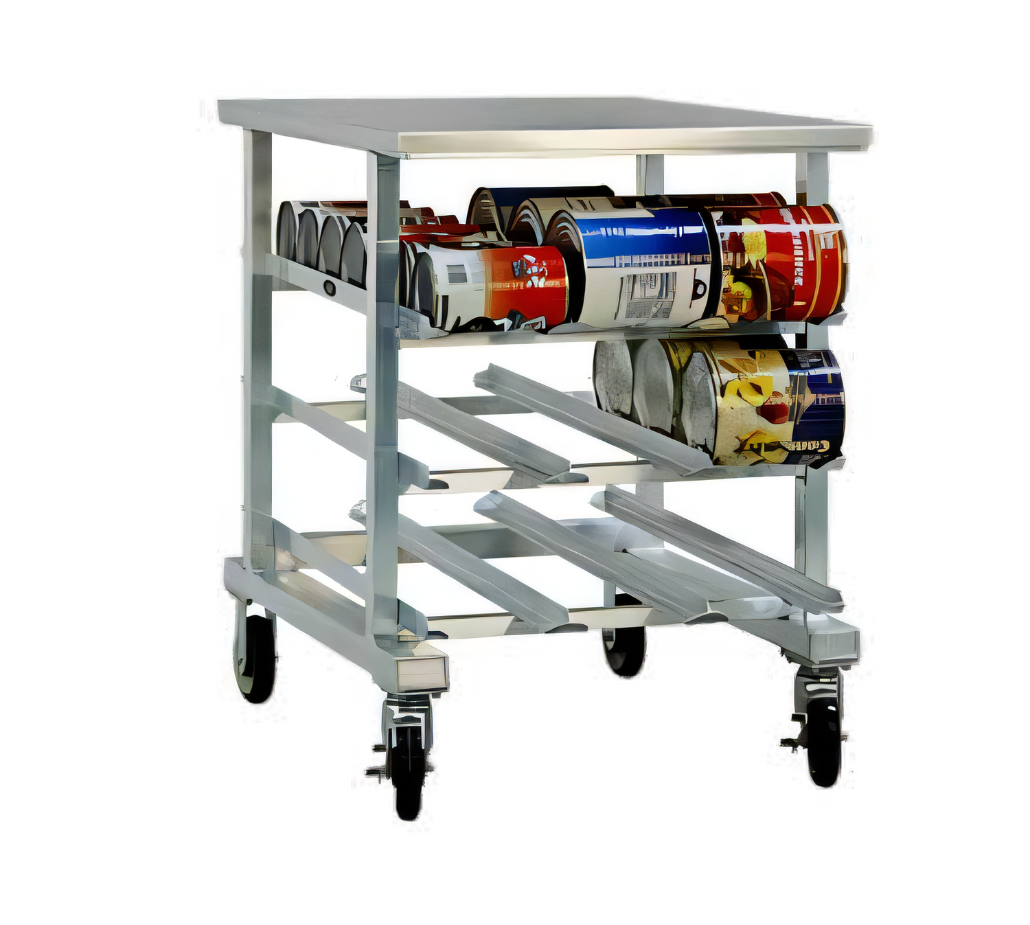 Can Storage Rack, mobile, counter height, aluminum construction with stainless top, sloped glides, accommodates (54) #10 cans or (72) #5 cans, (2) swivel/brake & (2) rigid 5" platform casters, NSF, Made in USA, (standard factory lead time)