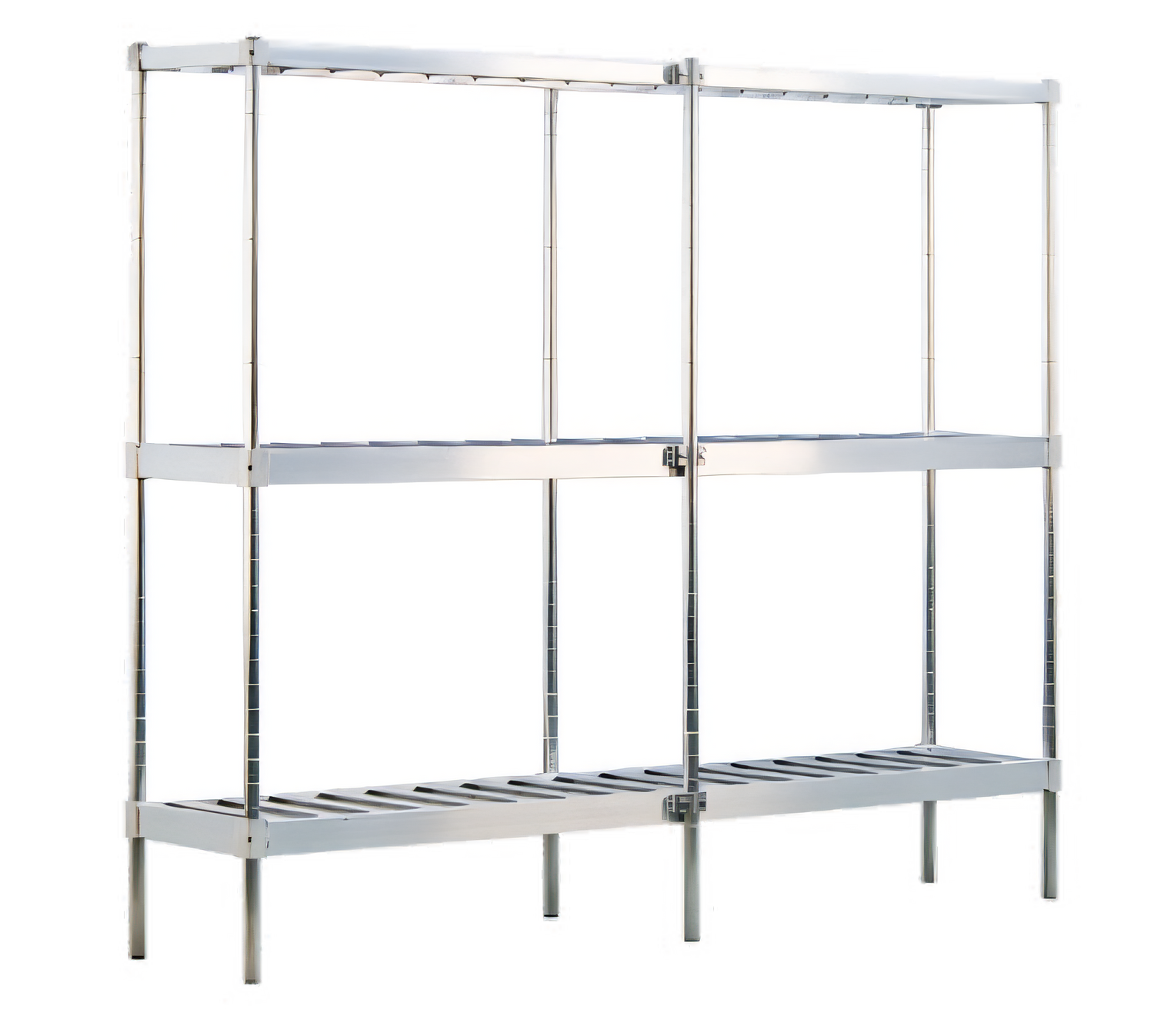 Keg Rack, 93"W x 18"D x 76"H, (10) 1/2 barrel keg capacity or (34) 1/6 barrel keg capacity, (3) shelves, "T"-Bar shelves, aluminum construction, NSF, Made in USA, (standard factory lead time)