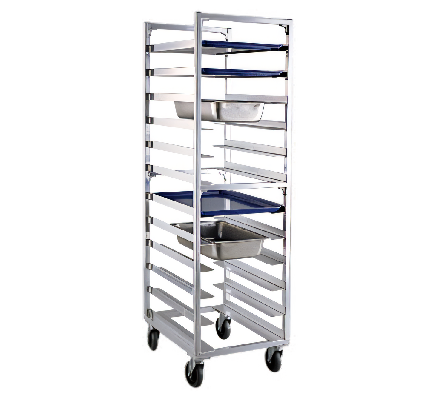 Rack, mobile, universal, open frame design, square tube construction, (12) universal slides, 5" centers, all-welded aluminum construction, end loading, slides for 12" x 20", 18" x 26" & 13" x 18" pans, 3-1/4" wide runners, (4) 5" platform casters, NSF, Made in USA, (standard factory lead time)