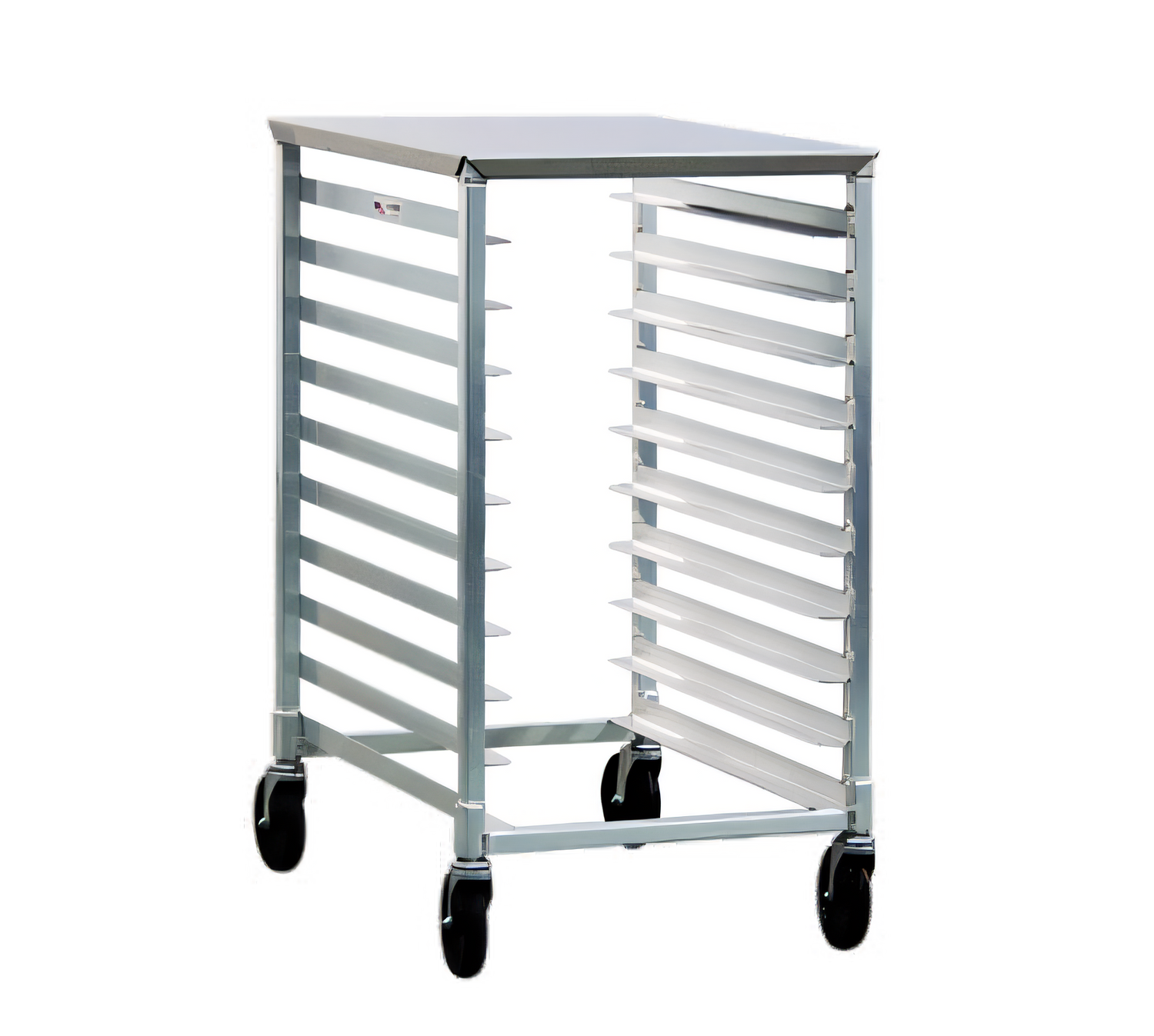 Bun Pan Rack, mobile, half-size, open sides, 10-pan capacity, accommodates 18" x 26", 14" x 18", or 13" x 18" pans, slides on 3" centers, all welded aluminum construction, end loading, stainless steel top, reinforced uprights, (4) 5" stem swivel casters, NSF, Made in USA, (standard factory lead time)