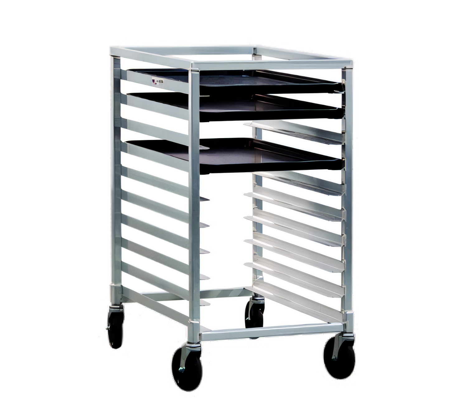 Bun Pan Rack, mobile, half-size, (10) 18" x 26", 14" x 18", or 13" x 18" pan capacity, slides on 3" centers, end loading, open sides, no top, reinforced uprights, all welded aluminum construction, (4) 5" stem swivel casters, NSF, Made in USA, (standard factory lead time)
