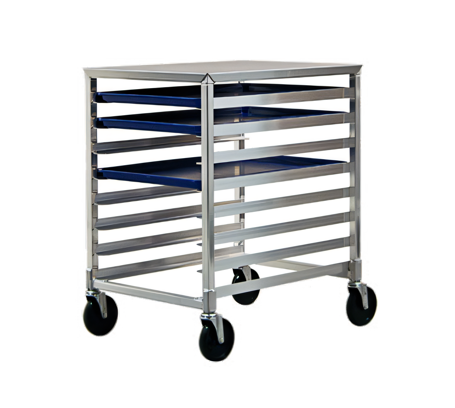 Bun Pan Rack, mobile, undercounter, all welded aluminum construction, open sides, 8-pan capacity, accommodates 18" x 26", 14" x 18", or 13" x 18" pans, slides on 3" centers, end loading, stainless steel top, reinforced uprights, (4) 5" stem swivel casters, NSF, Made in USA, (standard factory lead time)