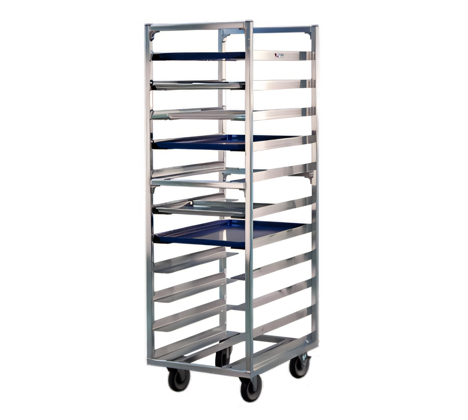 Roll-In Refrigerator/Proofer Rack, universal, open frame design, 64"H, wide angle slides for (11) 18" x 26" pans, slides on approximately 5" centers, all welded aluminum construction, end loading, (4) 5" platform casters, (2) swivel, (2) swivel with brakes, NSF, Made in USA, (standard factory lead time)