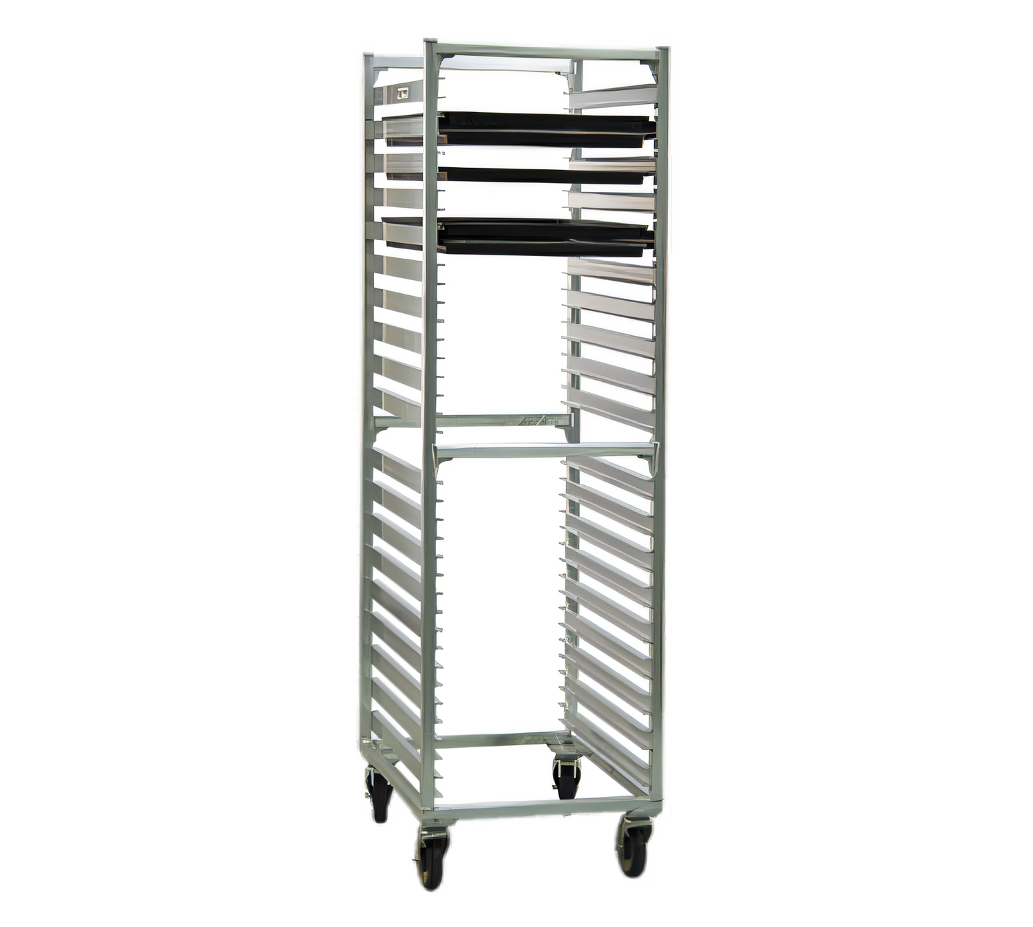 Bun Pan Rack, mobile, full height, open sides, accommodates (38) 18" x 26" pans, slides on 1-1/2" centers, all welded aluminum construction, end loading, (4) 5" platform swivel casters, NSF, Made in USA, (standard factory lead time)