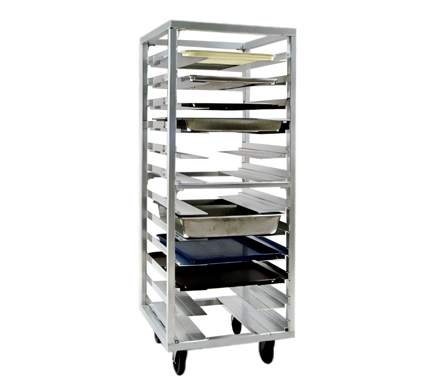 Universal Pan Rack, mobile, 24-1/2"W x 25-1/4"D x 64-1/2"H, 12-pair stepped-angle runners, 4-1/2" spacing, accommodates 12" x 20" to 18" x 26" pans, welded aluminum construction, end loading, 5" swivel platform casters, NSF, Made in USA, (standard factory lead time)