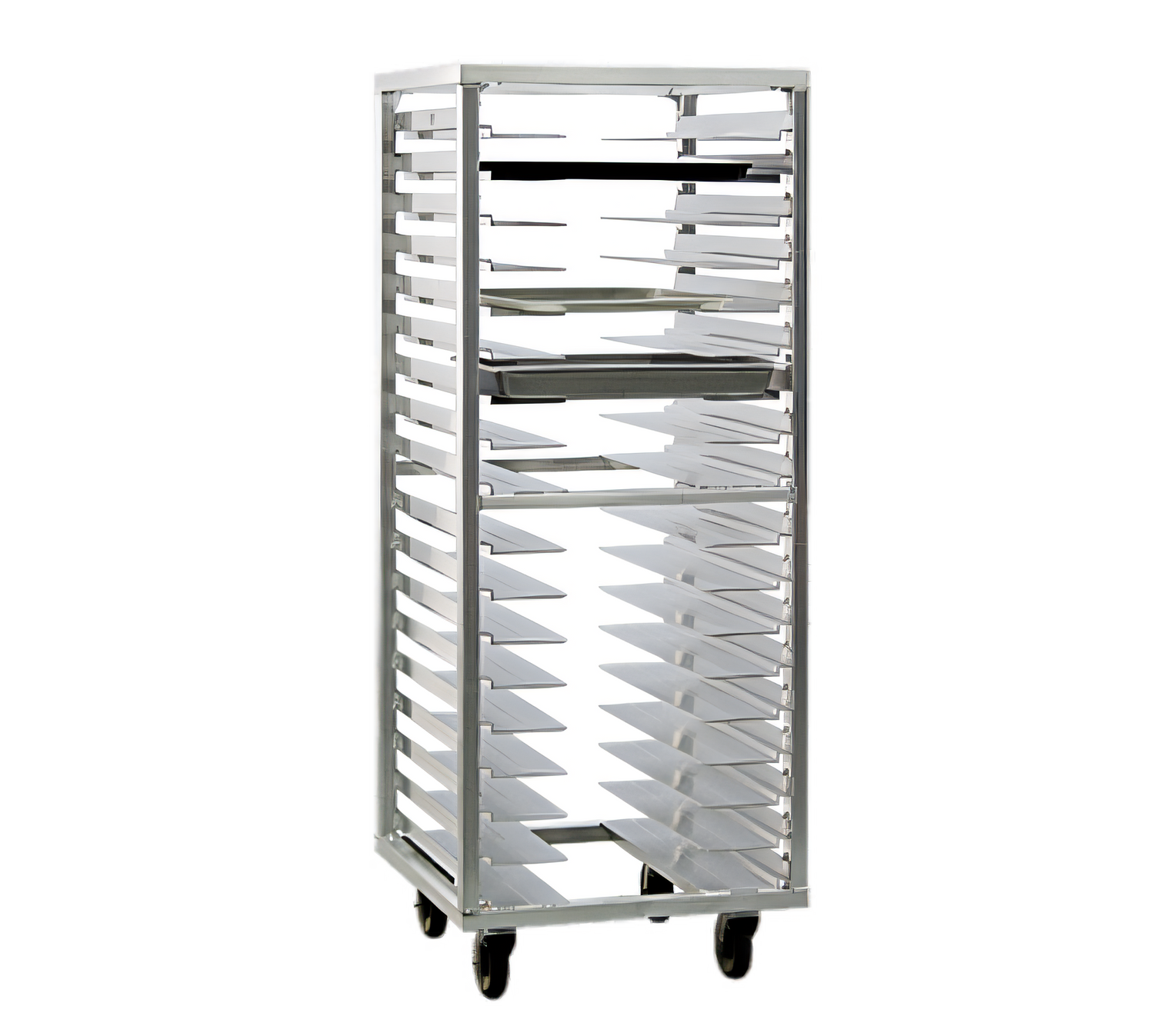 Universal Pan Rack, mobile, 24-1/2"W x 24-1/4"D x 64-1/2"H, 18-stepped-angle runners, 3" spacing, accommodates 12" x 20" to 18" x 26" pans, welded aluminum construction, end loading, 5" swivel platform casters, NSF, Made in USA, (standard factory lead time)