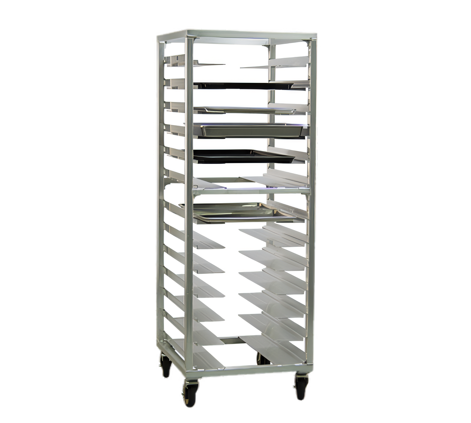 Universal Pan Rack, mobile, 24-1/2"W x 26"D x 71-1/8"H, 13-stepped-angle runners, 4-1/2" spacing, accommodates 12" x 20" to 18" x 26" pans, welded aluminum construction, end loading, 5" swivel platform casters, NSF, Made in USA, (standard factory lead time)
