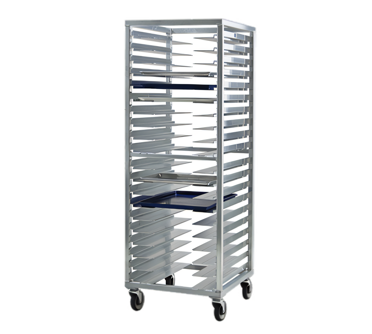 Universal Pan Rack, mobile, 24-1/2"W x 26"D x 71-1/8"H, 20-stepped-angle runners, 3" spacing, accommodates 12" x 20" to 18" x 26" pans, welded aluminum construction, end loading, 5" swivel platform casters, NSF, Made in USA, (standard factory lead time)