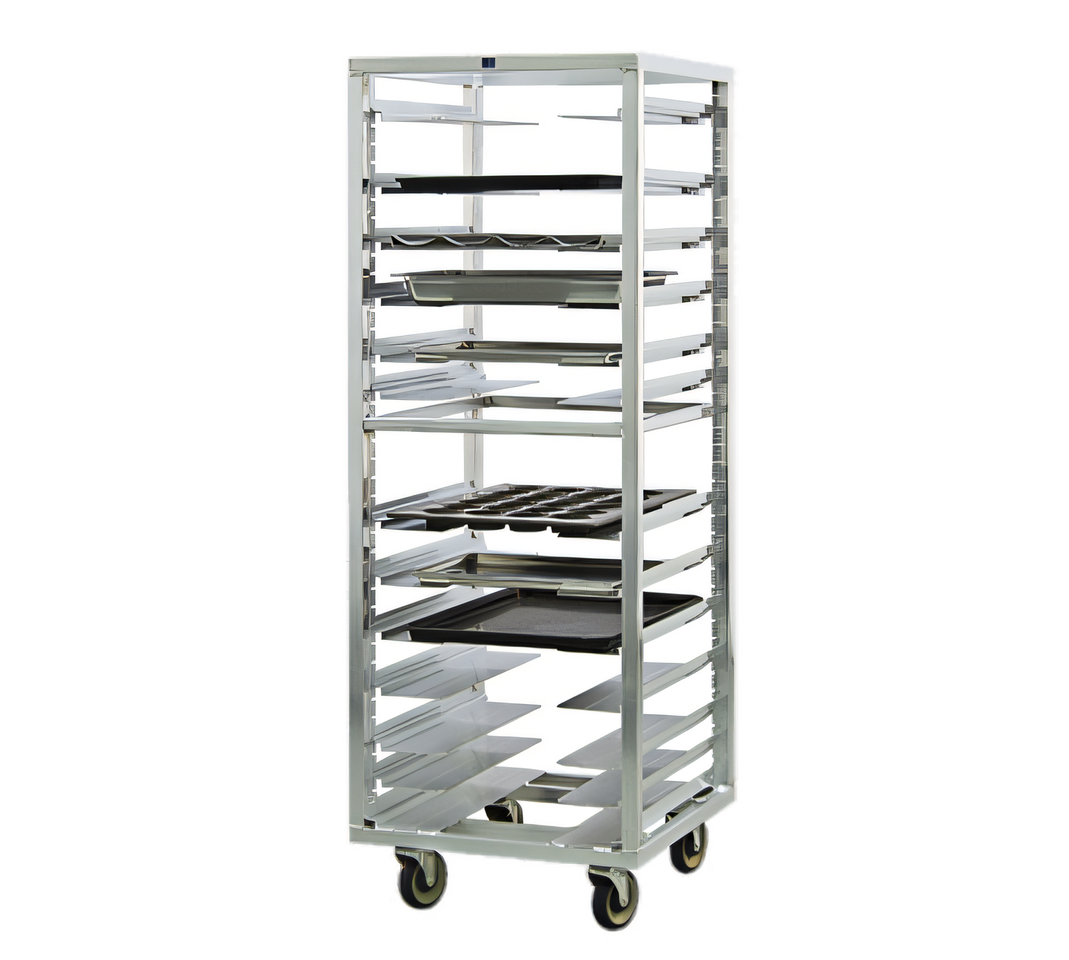 Pan Rack, roll-in, (12) universal adjustable aluminum guides, bottom pan slides are welded in place, 4-1/2" OC for 12 x 20 to 18 x 26 pans, 1-1/2" centers, end loading, 5" platform swivel casters, NSF, Made in USA, (standard factory lead time)