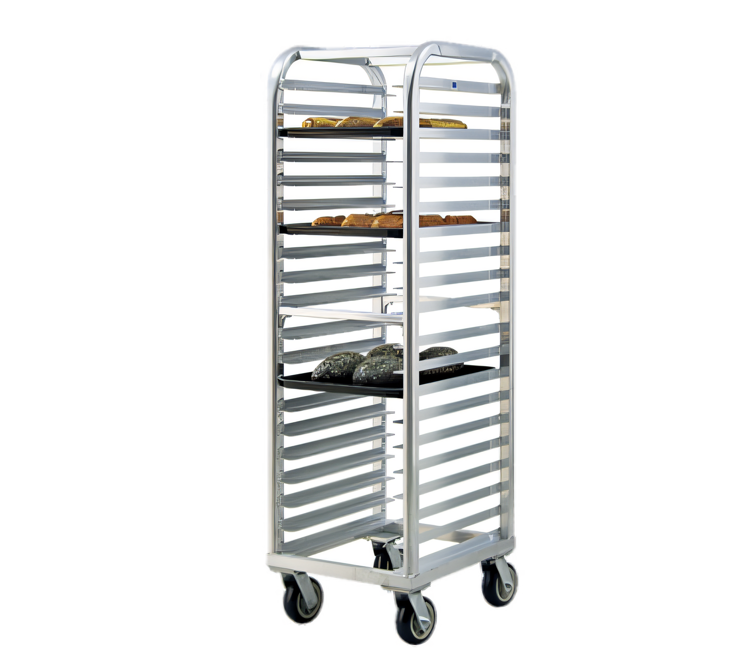 Lifetime Series Bun Pan Rack, heavy duty, aluminum, 73"H, (20) angle runners are 1-1/4" x 2" x .100 with 3" spacing (non-adjustable), extruded aluminum guides for 18 x 26 pans, fully welded 1-1/2" x 1-3/4" x .07" smooth wall D-tube uprights, end loading, (4) 6" x 2" platform swivel casters, NSF, Made in USA, (standard factory lead time)