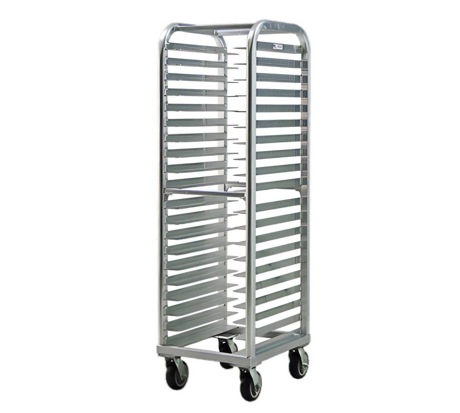 Lifetime Series Bun Pan Rack, heavy duty, aluminum, 73"H, (20) universal wide angle runners are 1-1/4" x 3-1/4" x .100 with 3" spacing (non-adjustable), extruded aluminum guides for 12 x 20 or 18 x 26 pans, fully welded 1-1/2"x1-3/4" x .07" smooth wall D-tube uprights, end loading, (4) 6" x 2" platform swivel casters, NSF, Made in USA, (standard factory lead time)