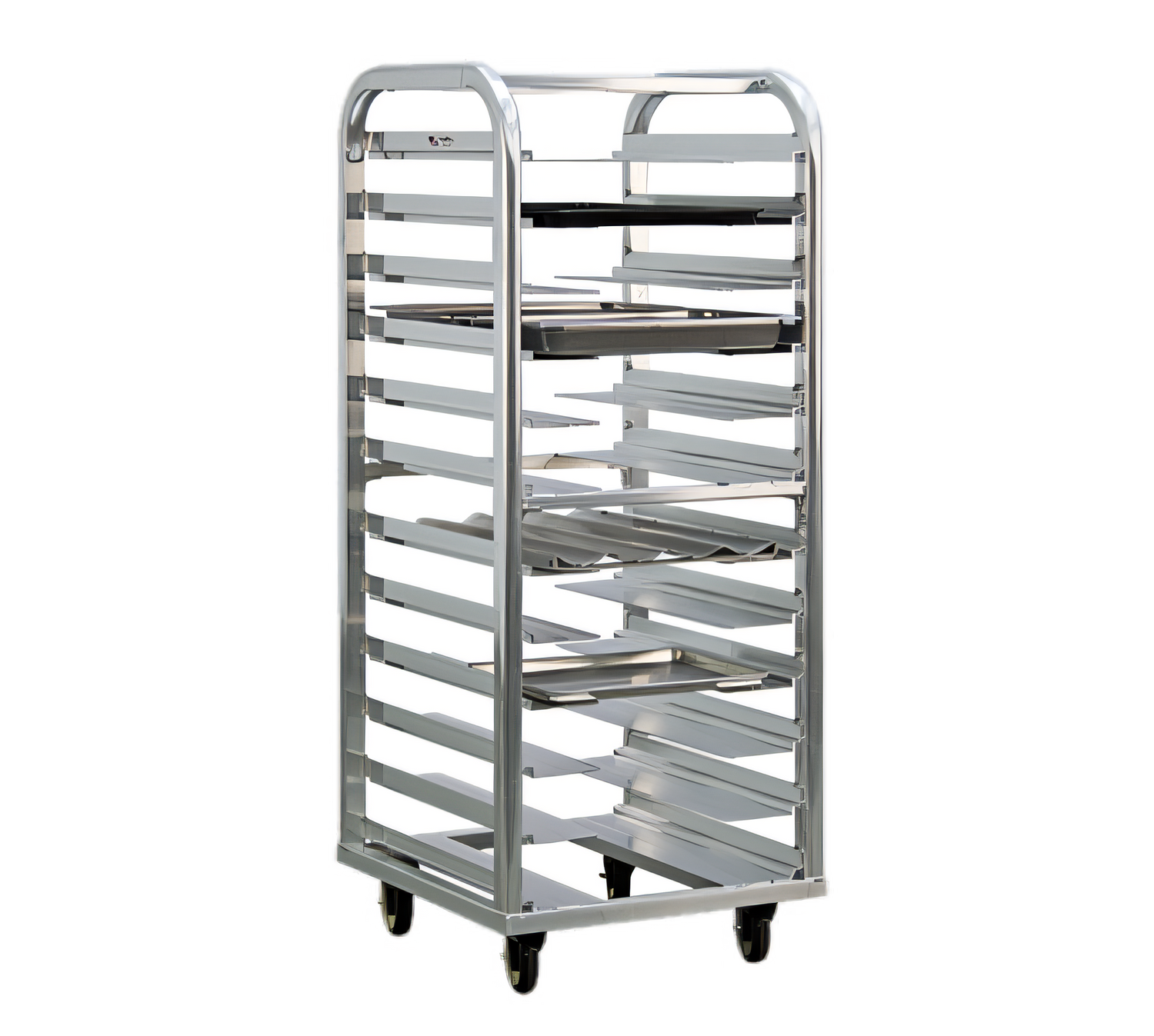 Lifetime Series Roll-In Bun Pan Rack, heavy duty, aluminum, 64"H, (12) stepped-angle runners are 2" x 6-3/16" x .100 with 4-1/2" spacing (non-adjustable), extruded aluminum guides for 12 x 20 to 18 x 26 pans, fully welded 1-1/2"x1-3/4" x .07" smooth wall D-tube uprights, end loading, (4) 5" platform swivel casters, NSF, Made in USA, (standard factory lead time)