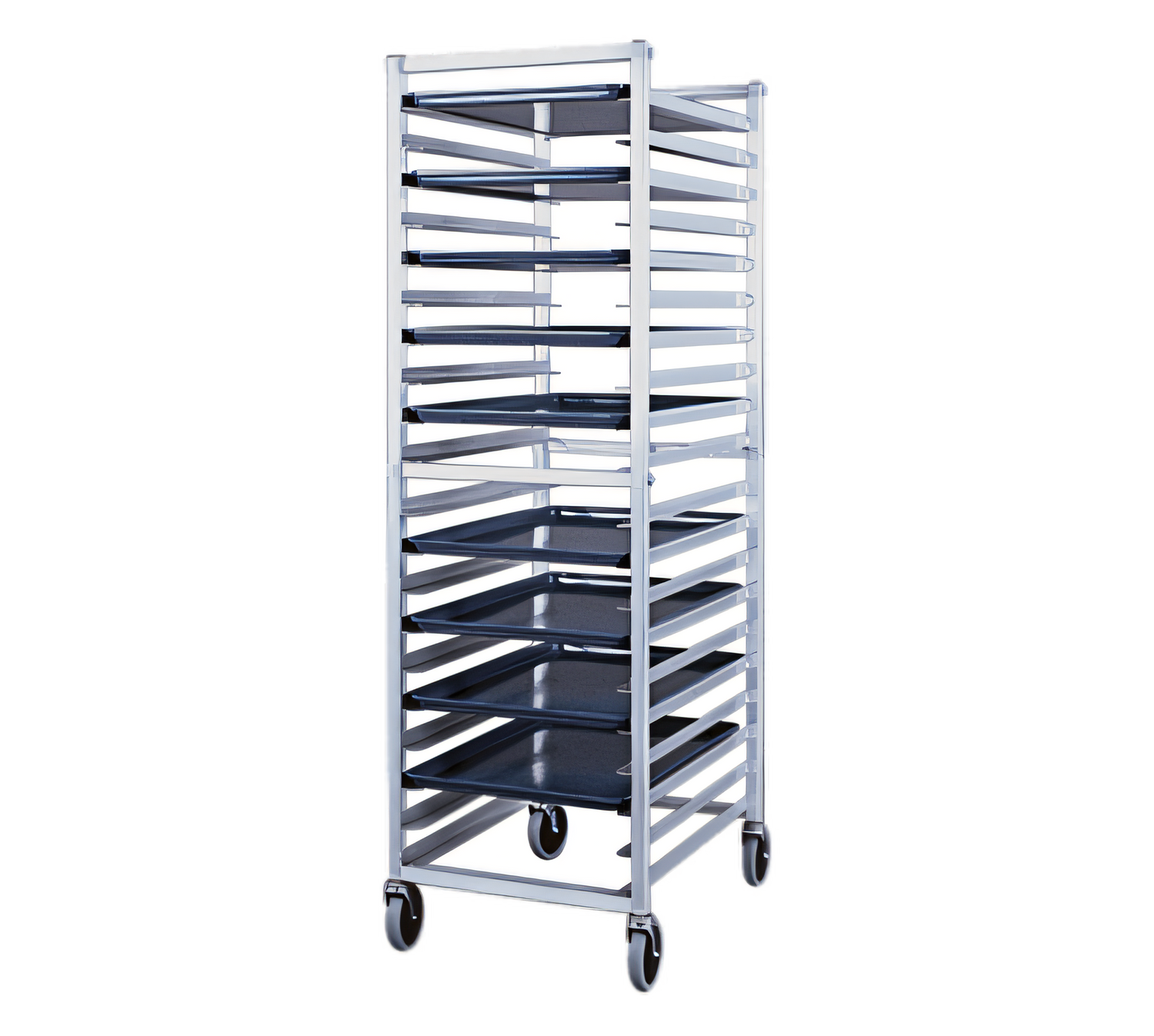 Bun Pan Rack, full height, open sides, with angle guides on 3" centers, capacity 20 - 18" x 26" sheet pans, bolted tubular aluminum frame, knock-down style, end loading, 5" stem type swivel casters, NSF, Made in USA, (standard factory lead time)