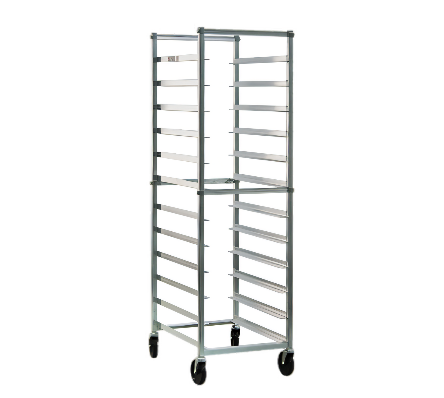 Bun Pan Rack, full height, open sides, with angle guides on 5" centers, capacity 12- 18" x 26" sheet pans, bolted tubular aluminum frame, knock-down style, end loading, 5" stem type swivel casters, NSF, Made in USA, (standard factory lead time)
