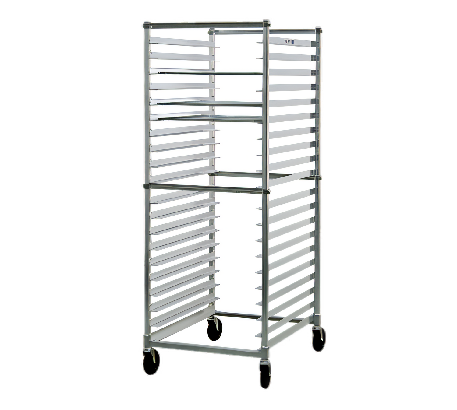 Donut Screen Rack, mobile, full height, open sides, with slides for (20) 23" x 33" donut screen, 3" spacing, end loading, 5" stem casters, NSF, KD, Made in USA, (standard factory lead time)