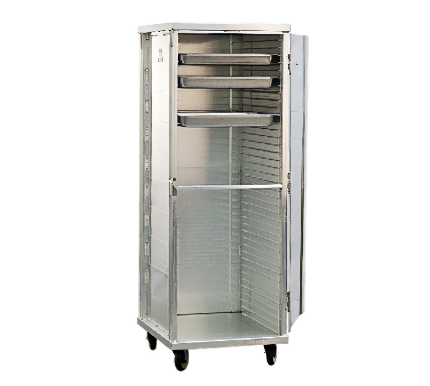 Pan Rack, mobile, full height, enclosed, with slides for (24) 12" x 20" pans, slides on 1-1/2" centers, all welded aluminum construction, end loading, HD base, (4) 5" platform swivel casters, NSF, Made in USA, (standard factory lead time)