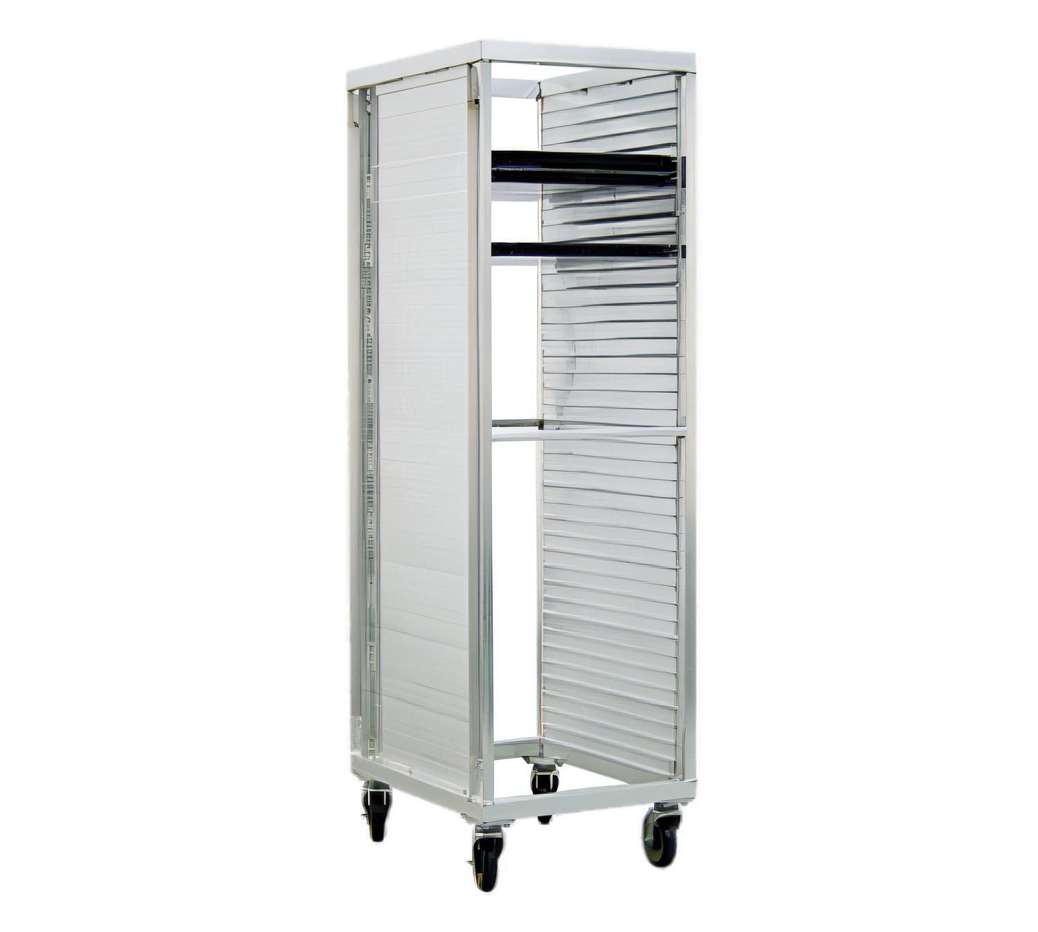 Bun Pan Rack, mobile, full height, closed sides, open ends, top & bottom with slides for (39) 18"x26" pans, slides on 1-1/2" centers, all welded aluminum construction, end loading, HD base, (4) 5" platform swivel casters, NSF, Made in USA, (standard factory lead time)