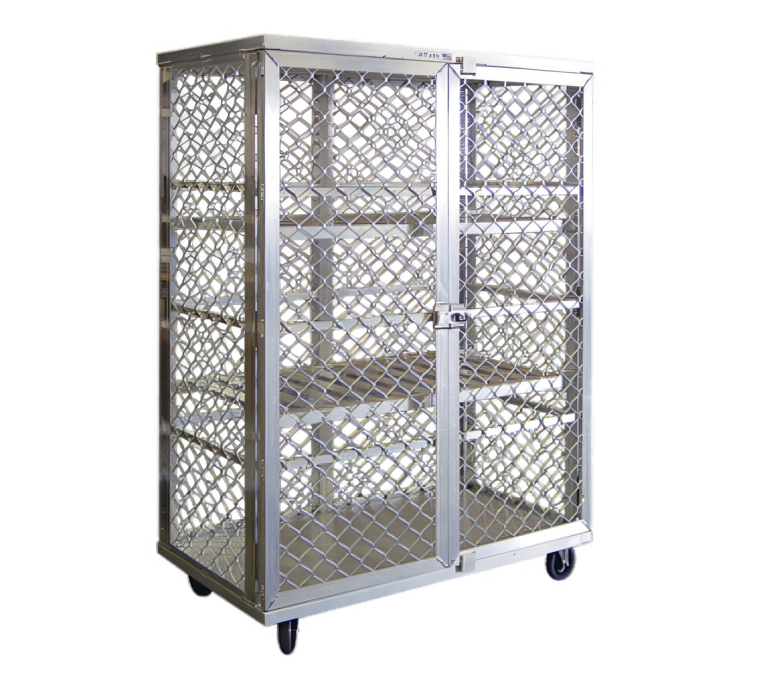 Security Cage, mobile, 49"W x 26-3/4"D x 71"H, (2) 23-1/2" x 45-3/4" intermediate shelves, double doors with stainless steel hasp, replaceable stainless steel hinges, all welded aluminum construction, (4) 5" plate casters, Made in USA, (standard factory lead time)