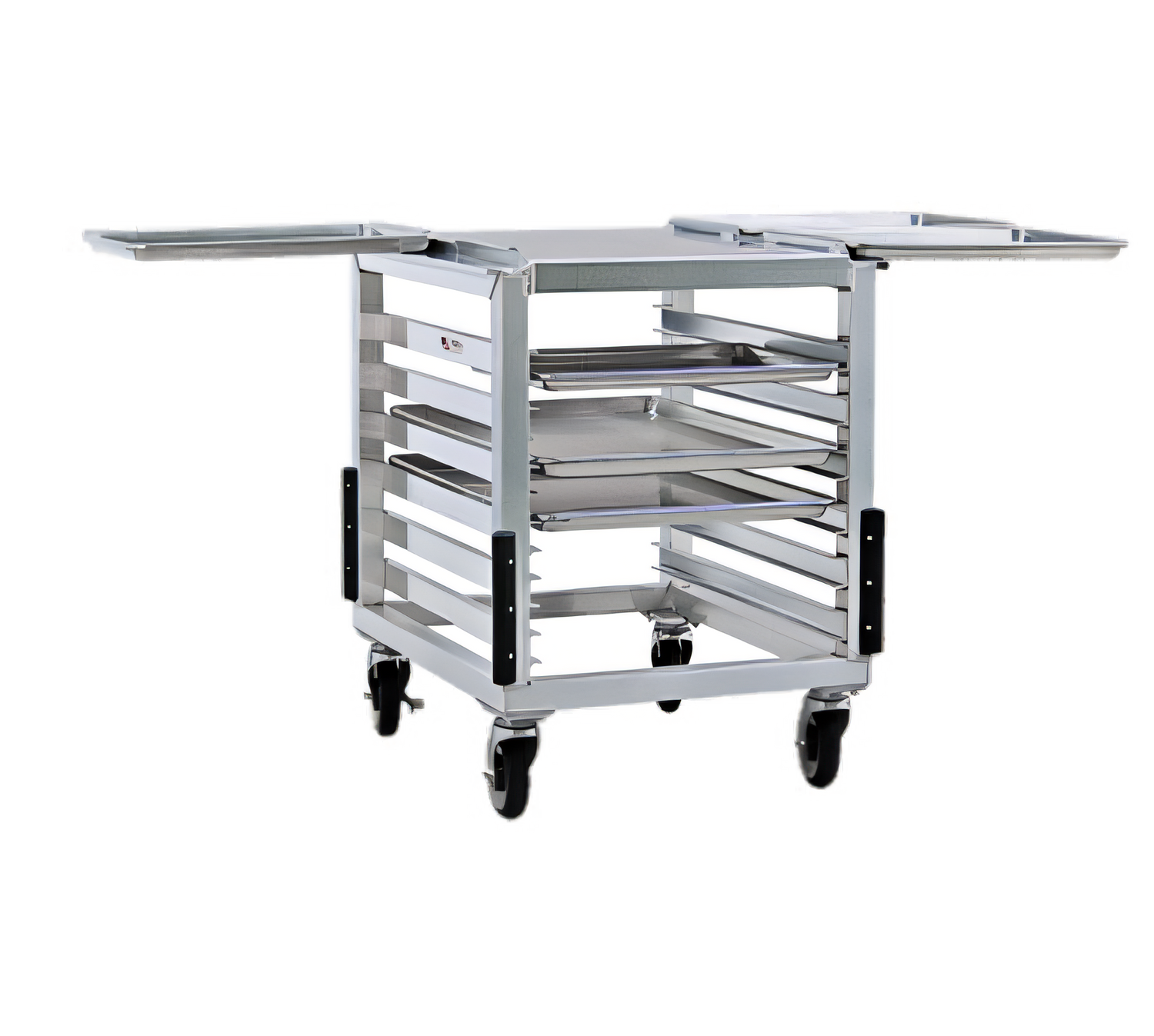 Slicer/Mixer Stand, mobile, aluminum construction, accommodates (24) 13" x 18" or (12) 18" x 26" pans, 1-1/2" spacing, aluminum top with outrigger channels, vertical corner bumpers, (4) 5" swivel casters with brakes, NSF, Made in USA, (standard factory lead time)