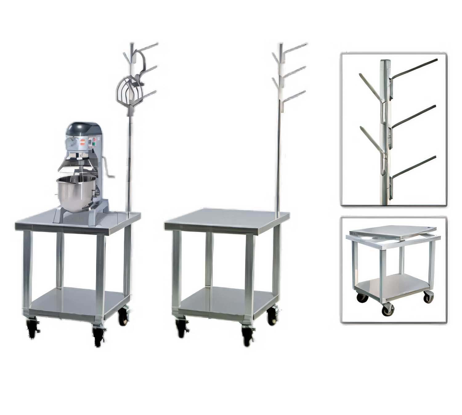 Mixer Stand, 29"W x 23"D x 28"H, 16 gauge stainless steel top with marine edge, stainless steel undershelf, 70"H accessory tree with (5) hangers, (4) 5" swivel casters with brakes, Made in USA, (standard factory lead time)