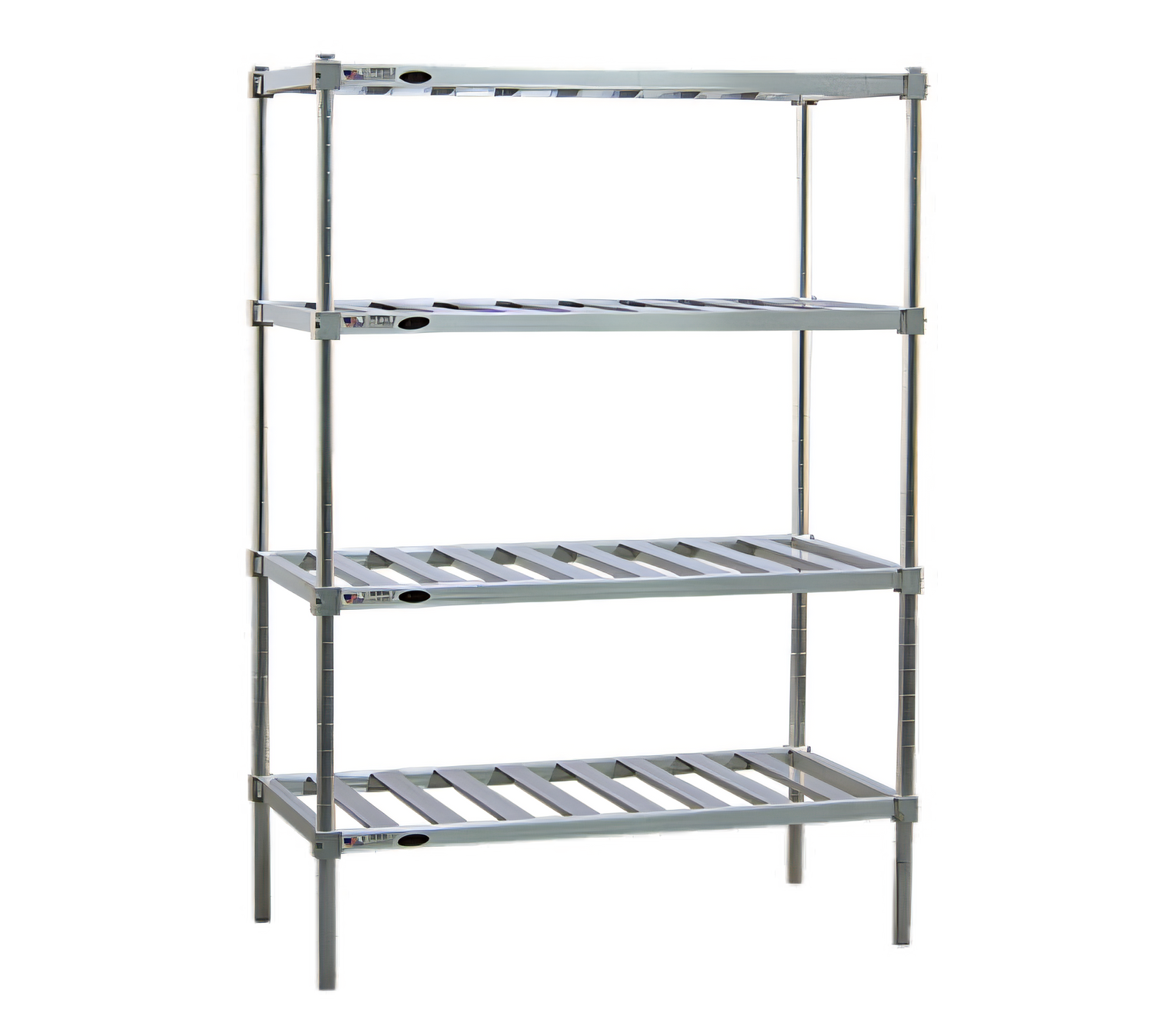 Pot & Pan Rack, stationary, 4-tier, 48"W x 24"D x 76"H, aluminum alloy construction, T-Bar shelf design adjustable in 2" increments, 900 lb. capacity, NSF, KD, Made in USA, (standard factory lead time)