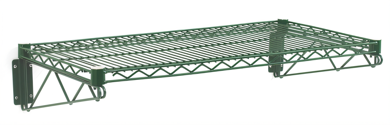 Olympic J1836WSK-SR Wall-Mounted Shelving — Durable wall mount kit featuring one 18" x 36" wire shelf and two 18" wall brackets with chromate finish and Olympic Green-Guard™ epoxy coating. NSF-certified for commercial use, this heavy-duty shelving provides corrosion-resistant storage ideal for kitchens, retail displays, and utility spaces. Easy to install and built for long-lasting performance.
