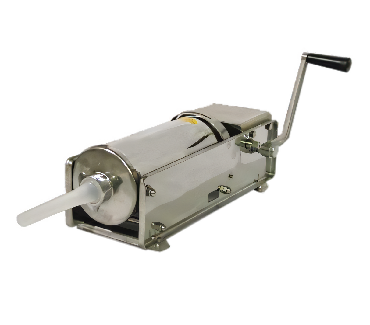Omcan USA 13738 Elite Series Manual Sausage Stuffer — heavy-duty, gear-driven horizontal stuffer with a 15 lb (7 kg) stainless steel cylinder and sturdy enameled steel body. Two-speed operation and included 10, 20, 30 & 40 mm funnels make precise stuffing easy for home or small commercial use. Durable stainless feet and Italian craftsmanship deliver reliable performance for sausages, salamis, and charcuterie.