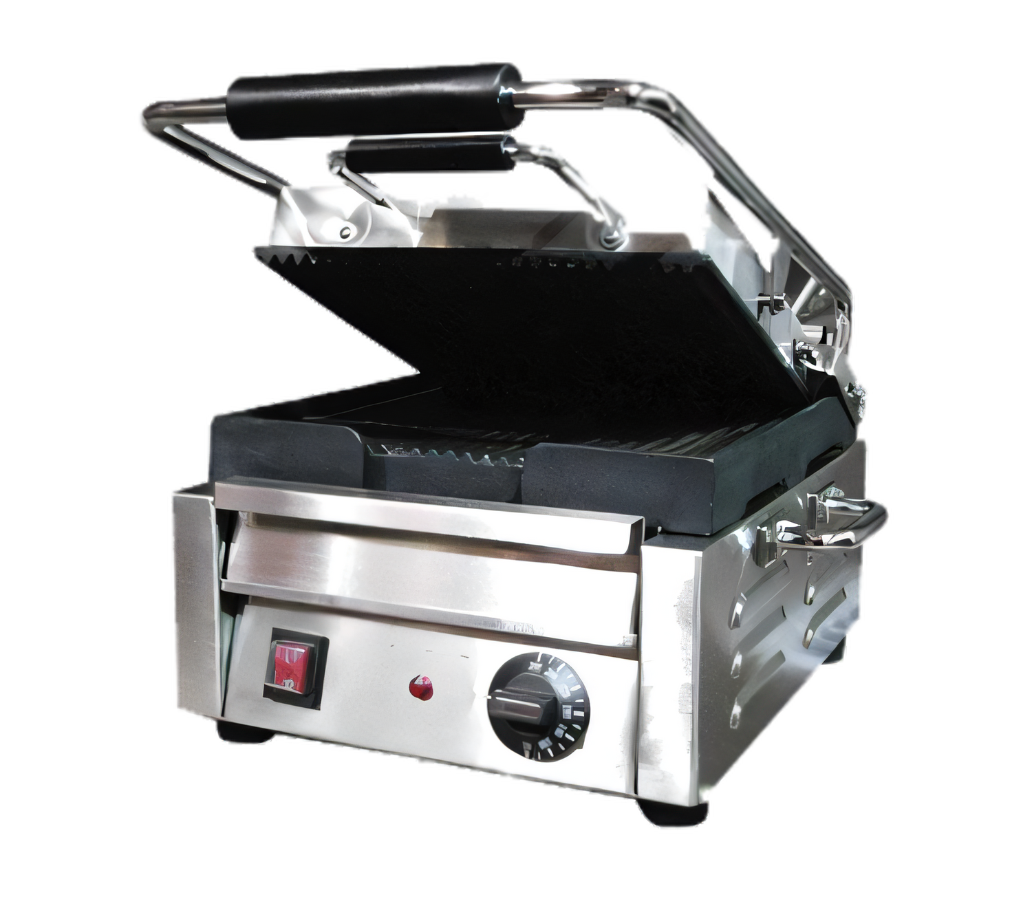 (PG-CN-0515-R) Panini Grill, single, 10" x 11" cooking surface, 572°F thermostat control, grooved cast iron top & bottom plates, cleaning brush included, stainless steel body, non-slip rubber feet, 15 amps, 1.8kW, 120v/60/1-ph, cord, NEMA 5-20P, QPS (shipped on pallet)