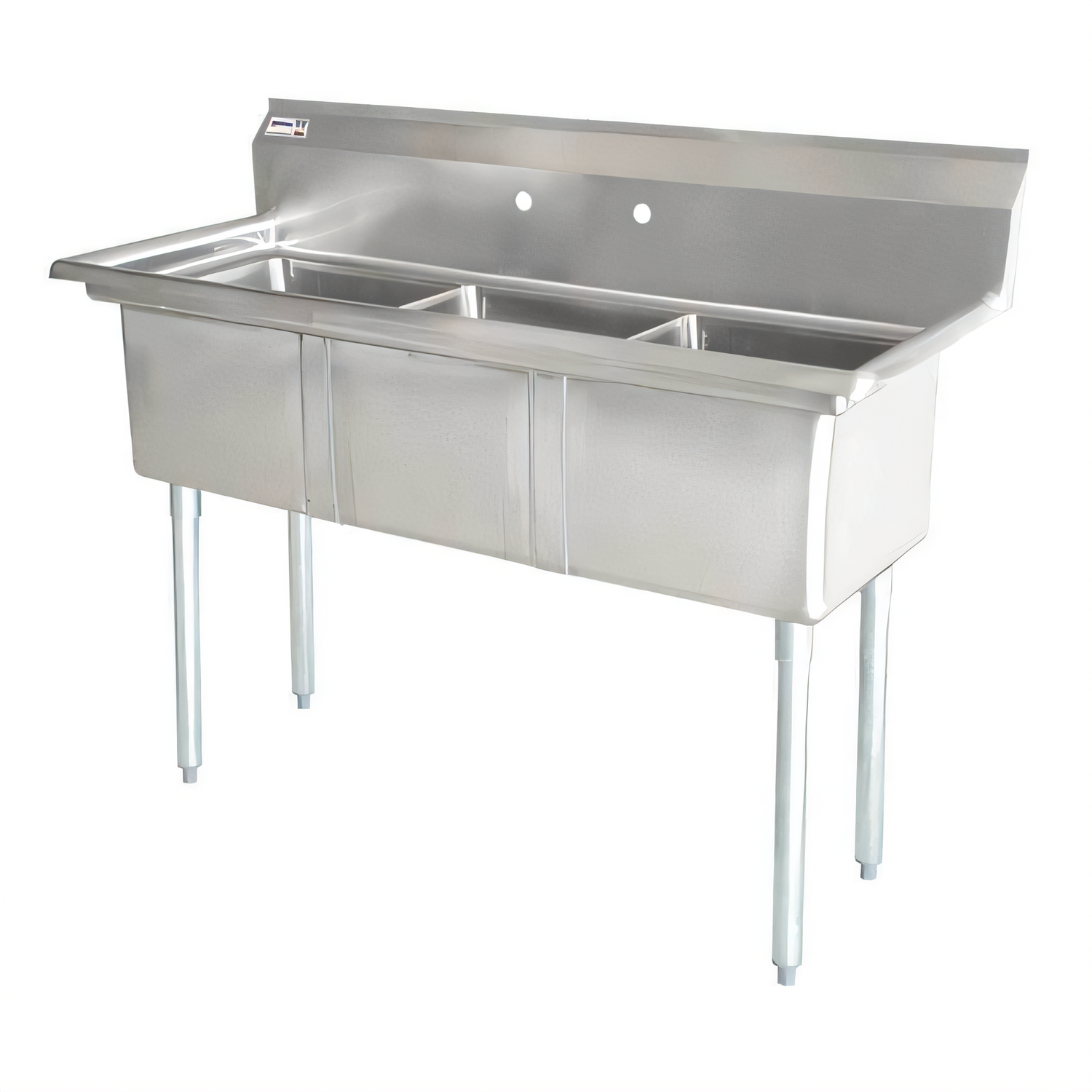 (25270) Pot Sink, (3) 21" front to back x 18" wide x 14" deep bowls, 8" center faucet holes, 9-3/4" backsplash, corner drains, galvanized legs with adjustable bullet feet, 18 gauge, 304 stainless steel, NSF (no drain board) (shipped on pallet)