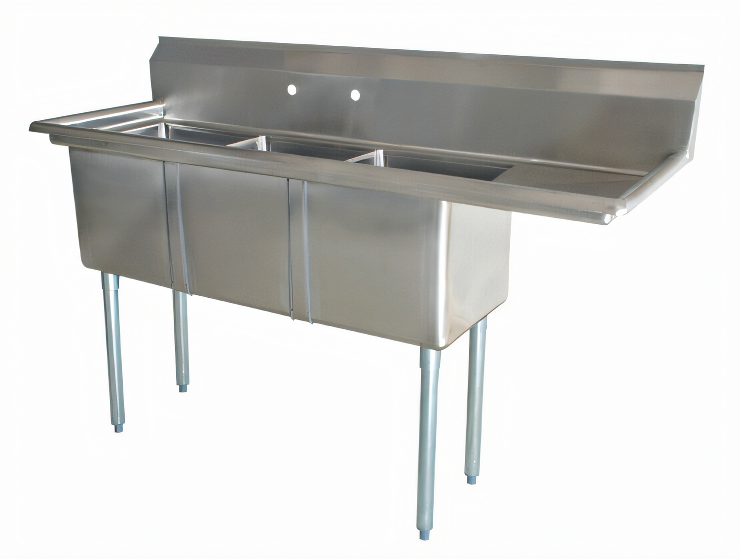 (25272) Pot Sink, (3) 21" front to back x 18" wide x 14" deep bowls, 8" center faucet holes, 9-3/4" backsplash, corner drains, right drain board, galvanized legs with adjustable bullet feet, 18 gauge, 304 stainless steel, NSF (shipped on pallet)