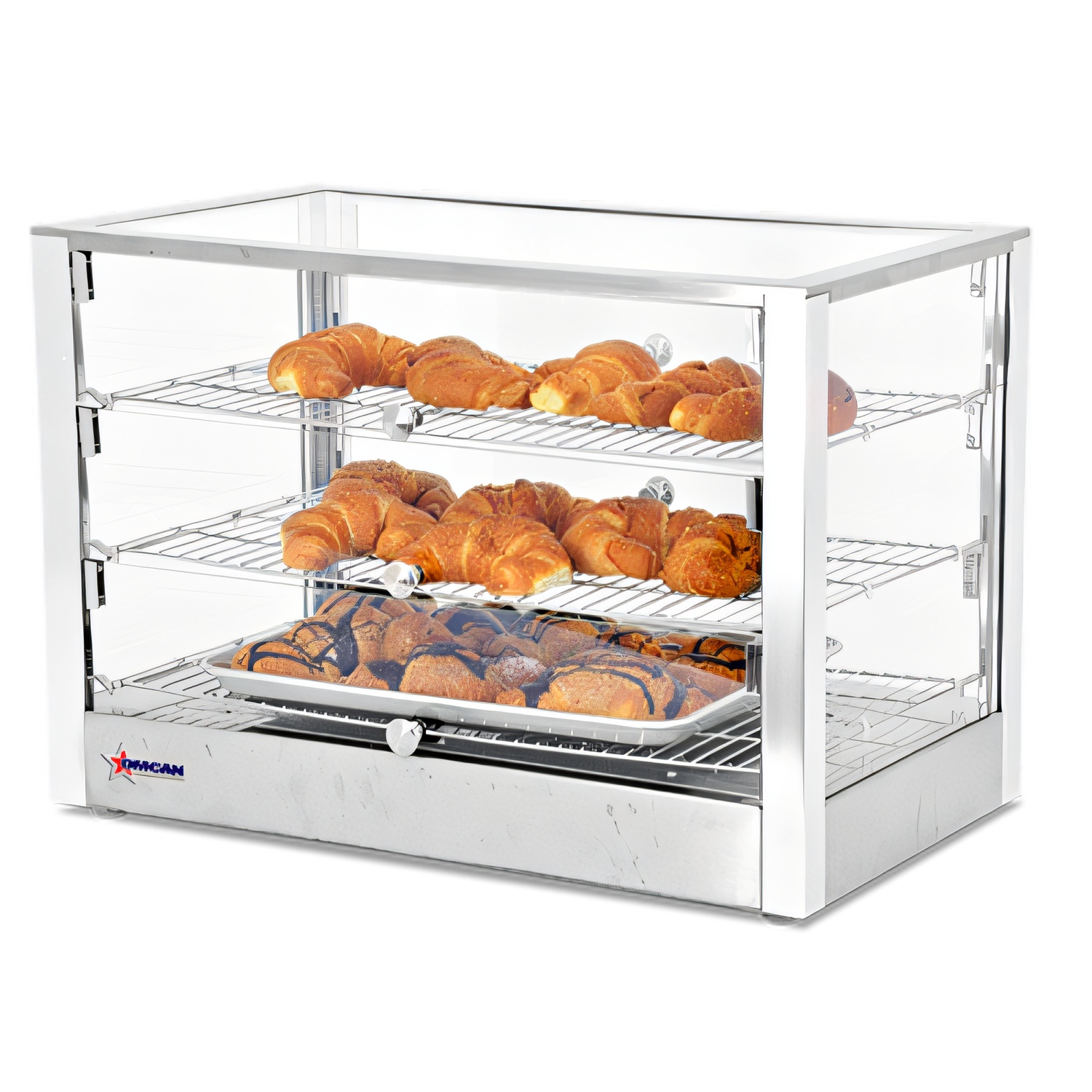 (DW-CN-0115L) Food Warmer/Display Case, countertop, full/self-service, 27-5/8"W x 15-3/4"D x 19-1/2"H, (86°F (30°C) to 194°F (90°C) temperature range, adjustable temperature control, LED interior lighting, (3) fixed chrome plated shelves, (3) hinged glass doors on front & rear, glass top & sides, stainless steel interior & exterior, 110v/60/1-ph, 1300 watts, cord, NEMA 5-15P (shipped on pallet)