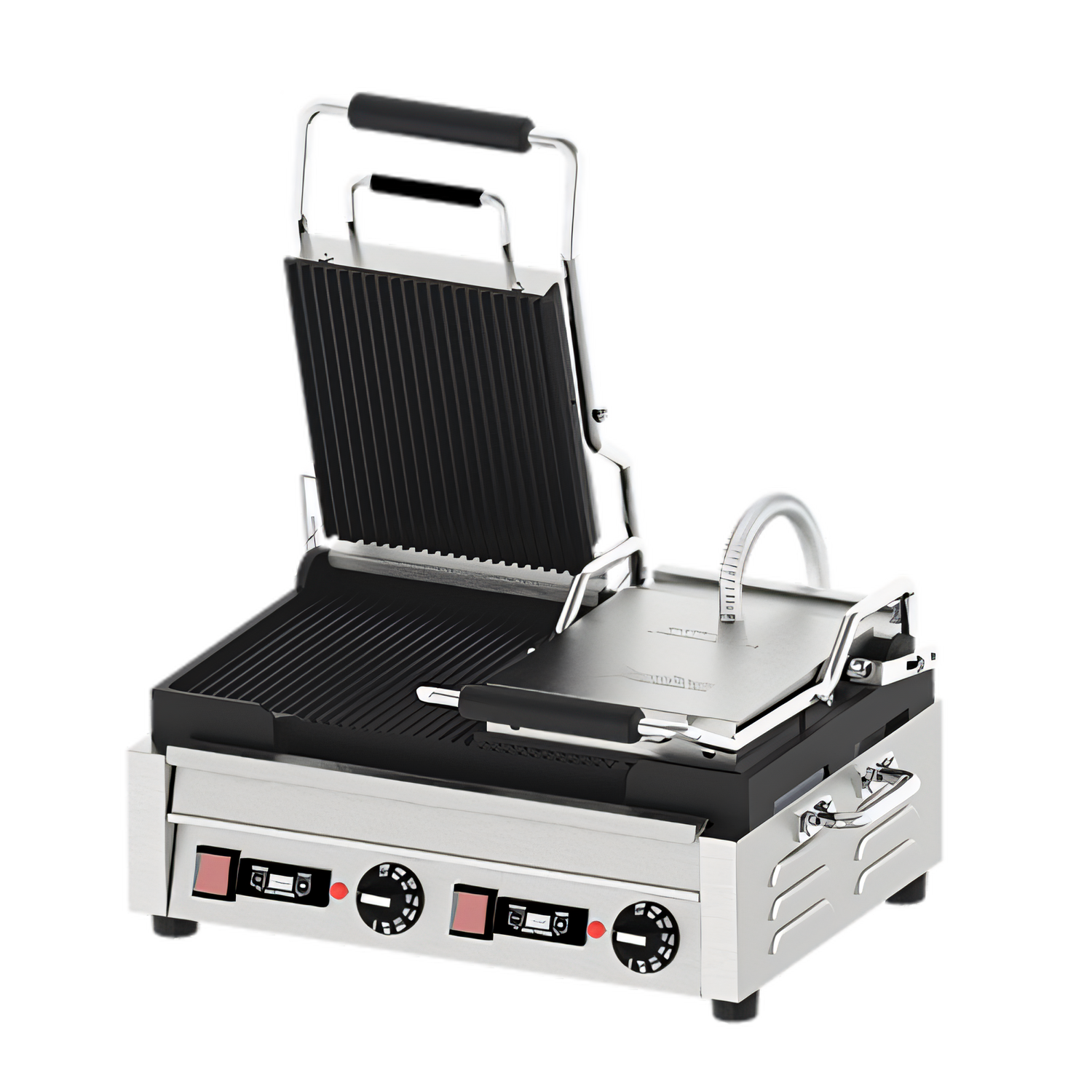 (PG-CN-0711-FT) Panini Grill, double, 18"W x 10"D cooking surface, 572°F thermostat control, grooved cast iron top & bottom plates, timer, cleaning brush included, stainless steel body, non-slip rubber feet, 14.5 amps, 3.2kW, 220v/60/1-ph, cord, NEMA 5-20P, QPS (shipped on pallet)