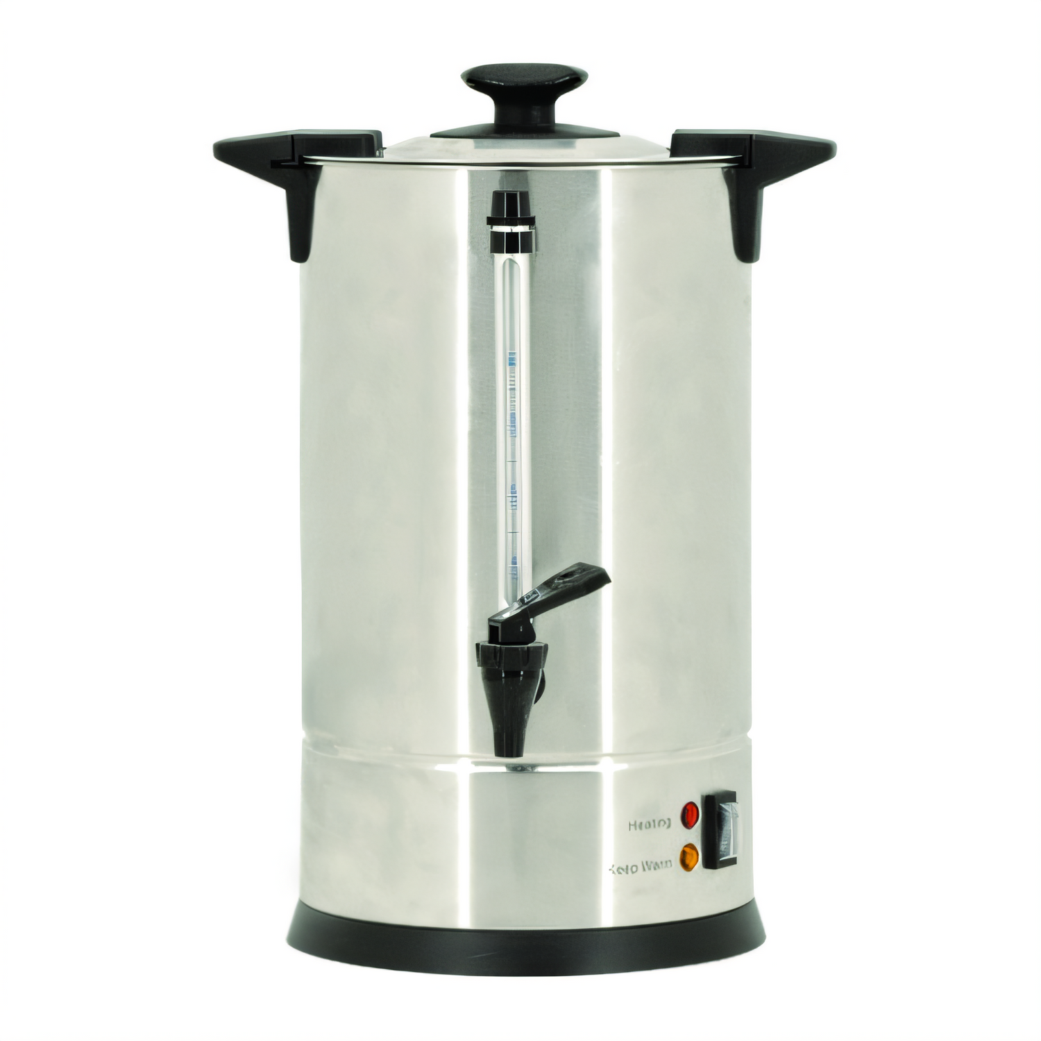 (CM-CN-0043) Coffee Percolator, 1.66 gallon, 43 cup per hour capacity, 32 minute max quantity time, water level gauge, coffee filter, locking lid, heat-resistant handles, non-drip water faucet, double-walled, brushed stainless steel, non-slip rubber feet, 110v/60/1-ph, 950 watts, cord, NEMA 5-15P, cETLus