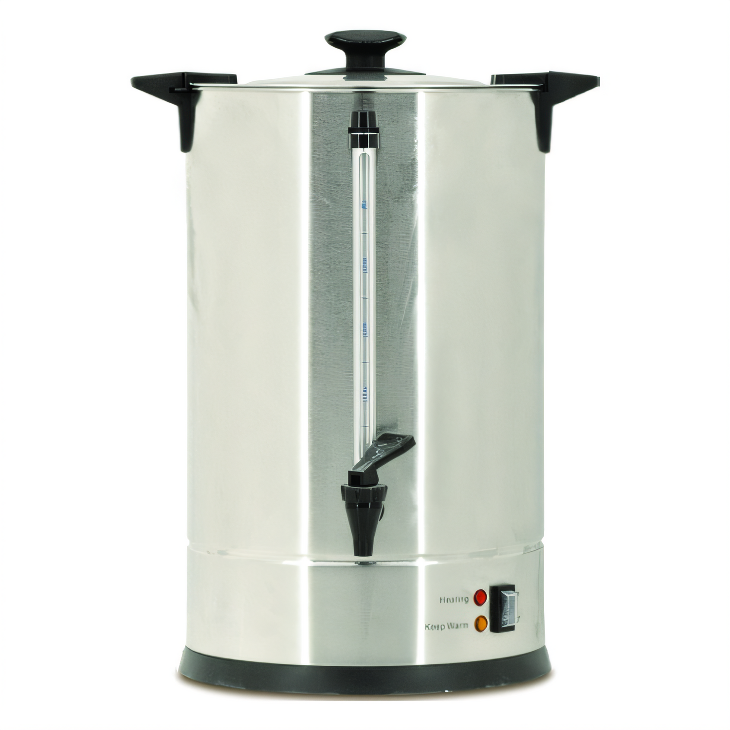 (CM-CN-0089) Coffee Percolator, 3.5 gallon, 89 cup per hour capacity, 43 minute max quantity time, water level gauge, coffee filter, locking lid, heat-resistant handles, non-drip water faucet, double-walled, brushed stainless steel, non-slip rubber feet, 110v/60/1-ph, 1500 watts, cord, NEMA 5-15P, cETLus