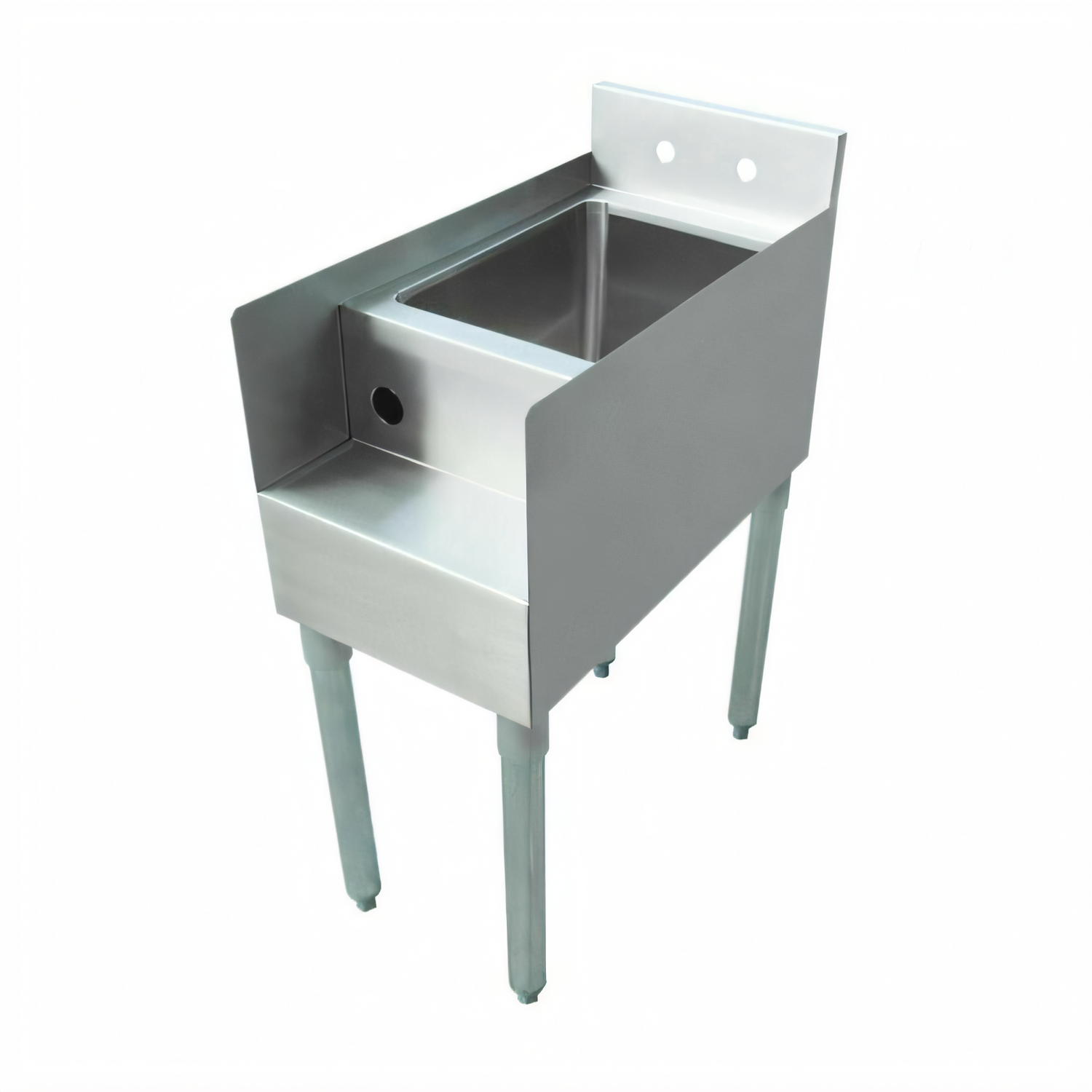 (43473) Blender Station, freestanding with dump sink, 9" x 9" x 4" deep bowl, recessed step, sides & hat channel, open back & bottom, 1" lps drain, 3" backsplash, 18 gauge, 304 stainless steel, galvanized legs with bullet feet