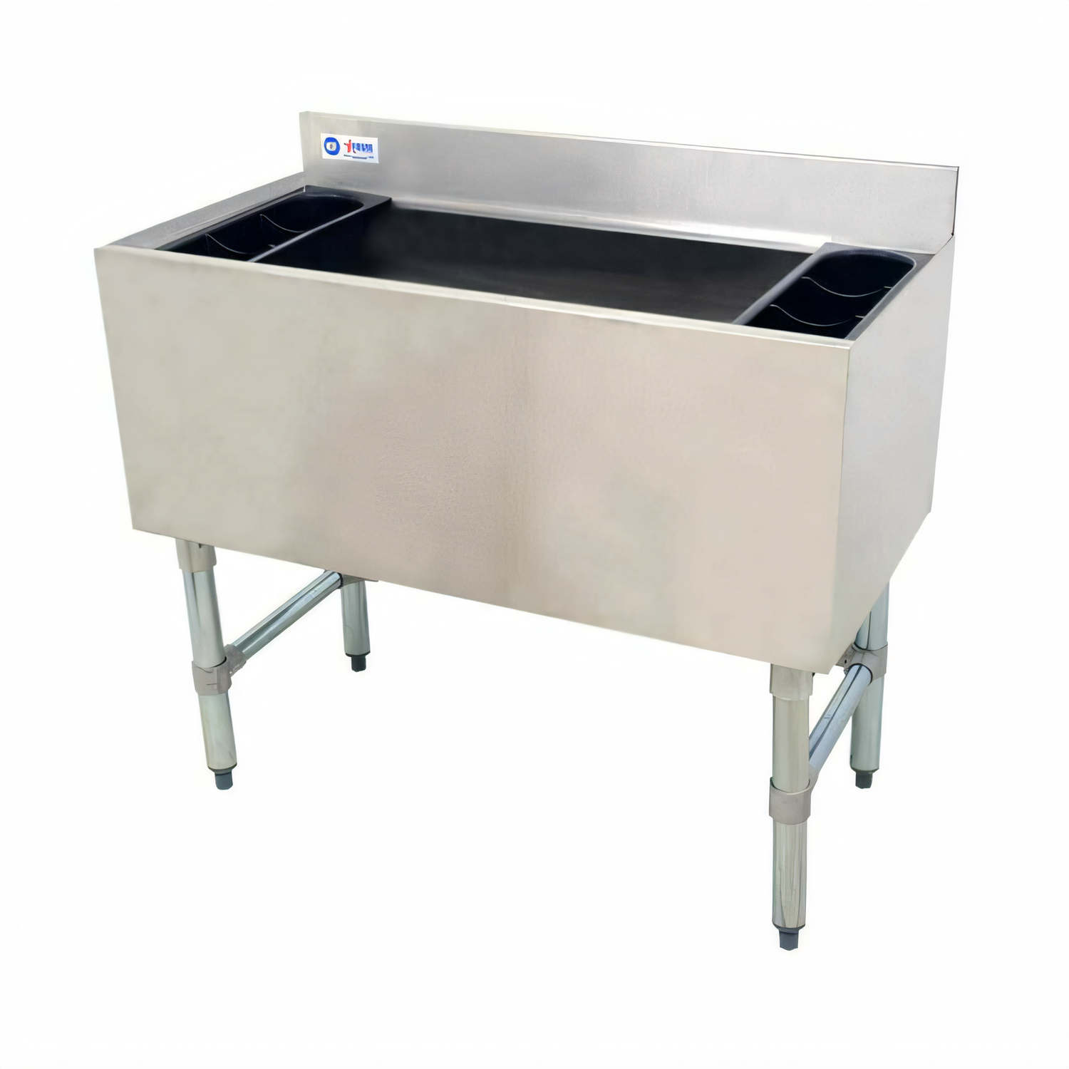 (43476) Ice Bin, 34"W x 14.8"D x 12" deep bowl, 20 gauge 304 stainless steel bowl, top, back, & body, 3"H backsplash, 1" drain, plastic bottle holder,18 gauge 430 stainless steel hat channel, back, side bottom & intermediate shelf, galvanized legs with "U" shape leg bracing & adjustable plastic bullet feet, NSF
