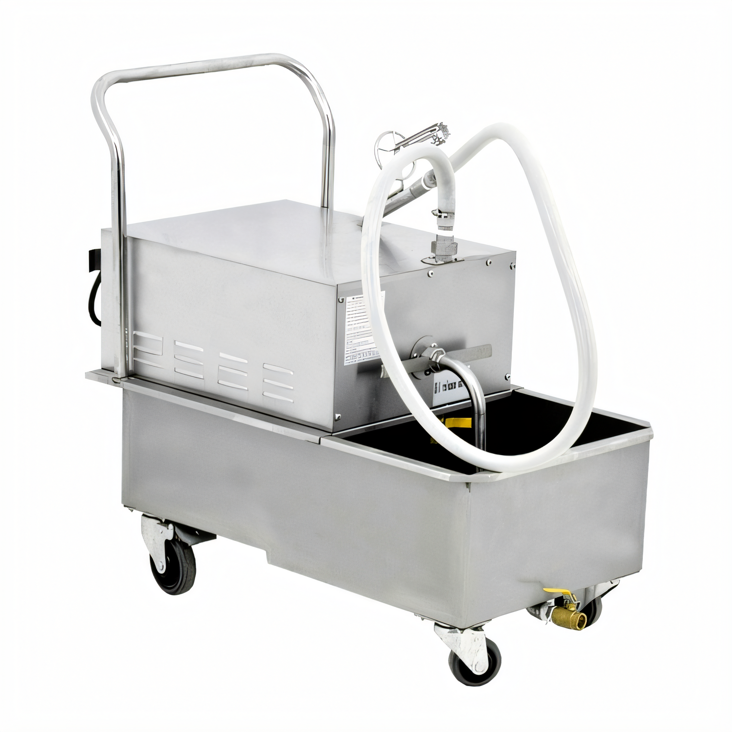 Roll the unit beneath the fryer, open the fryer’s drain, and let the pump do the rest. Hot oil passes through the stainless screen and filter paper, then returns crystal-clear to the fryer or stays in the covered tank until you’re ready. The entire cycle takes just a few minutes, saving up to 50 % on annual oil costs while delivering consistently great-tasting food.