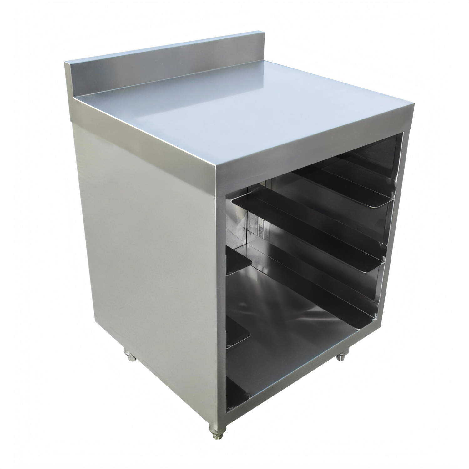 (44595) Glass Rack Storage Unit, flatboard top, 24"W x 23"D x 33"H, open front cabinet base, 3"H backsplash, 1" drain on bottom of unit, 18 gauge 304 stainless steel construction