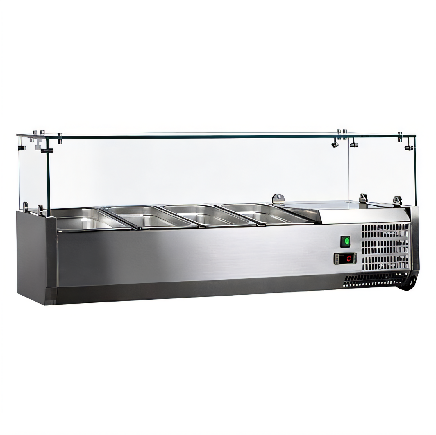(RS-CN-0004-P) Refrigerated Topping Rail, with glass sneeze guard, countertop, 47"W, holds (4) 1/3 GN pans or (8) 1/6 GN pan (pans sold separately), 36°F (2°C) to 50°F (10°C) temperature range, digital LED temperature display, side mounted self-contained refrigeration, 304 stainless steel construction, R600a, 140 watt, 120v/60/1-ph, 1.6 amps, cord, NEMA 5-15P, cETLus, ETL-Sanitation (shipped on pallet)